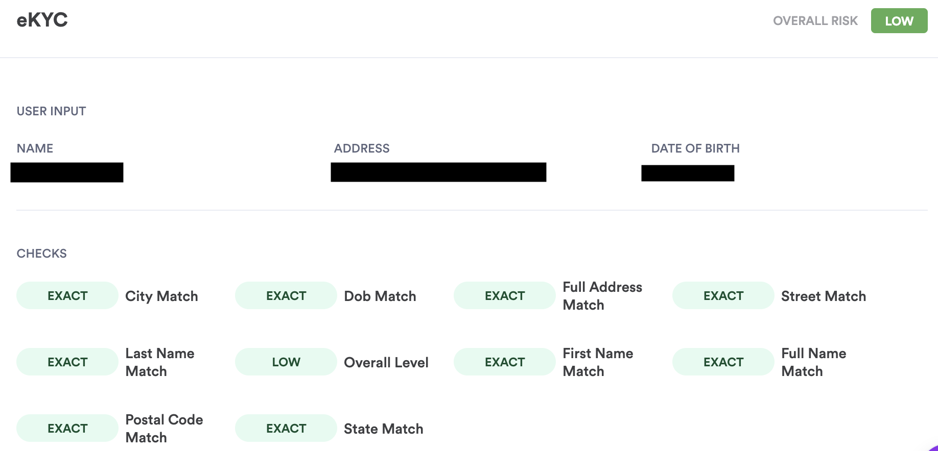 overallLevel  | low, medium, high  | Overall Risk Level is focused on the risk associated to the submitted full name, full address and date of birth. See context below for more information around how low, medium, and high are calculated  |