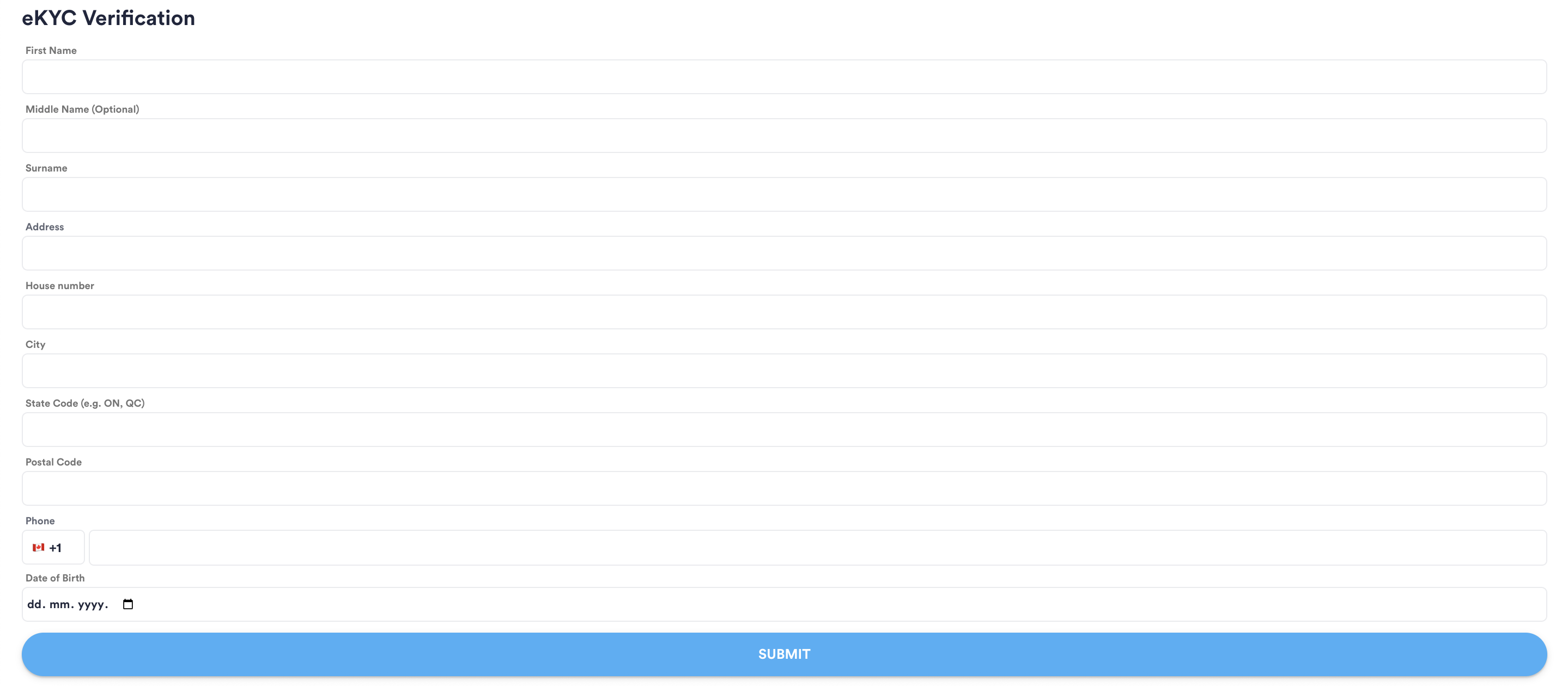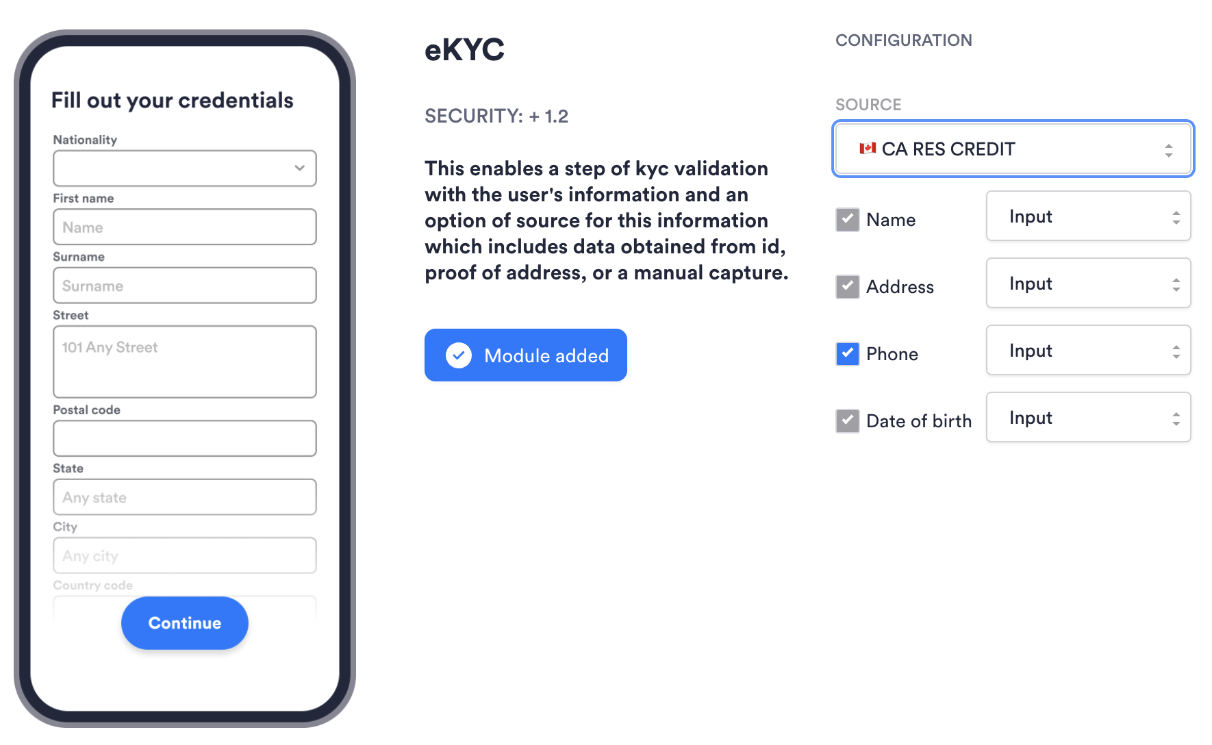eKYC module configuration gives various options to specify different search criteria with various sources of truth for each country (eg. US has multiple via Telco, Credit Bureau, and Driver's License). User data can be collected via a user input flow by using pre-selected fields where users can type in their name or date of birth, etc. See an example below: