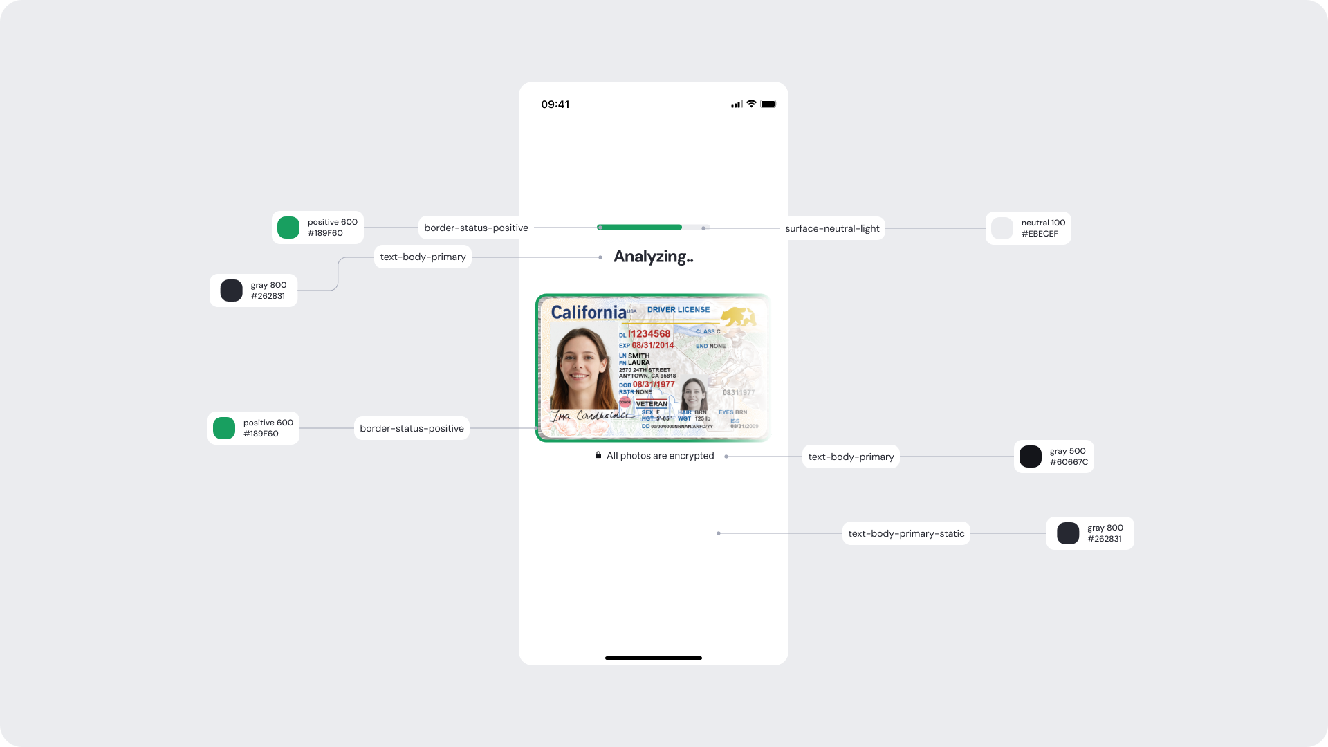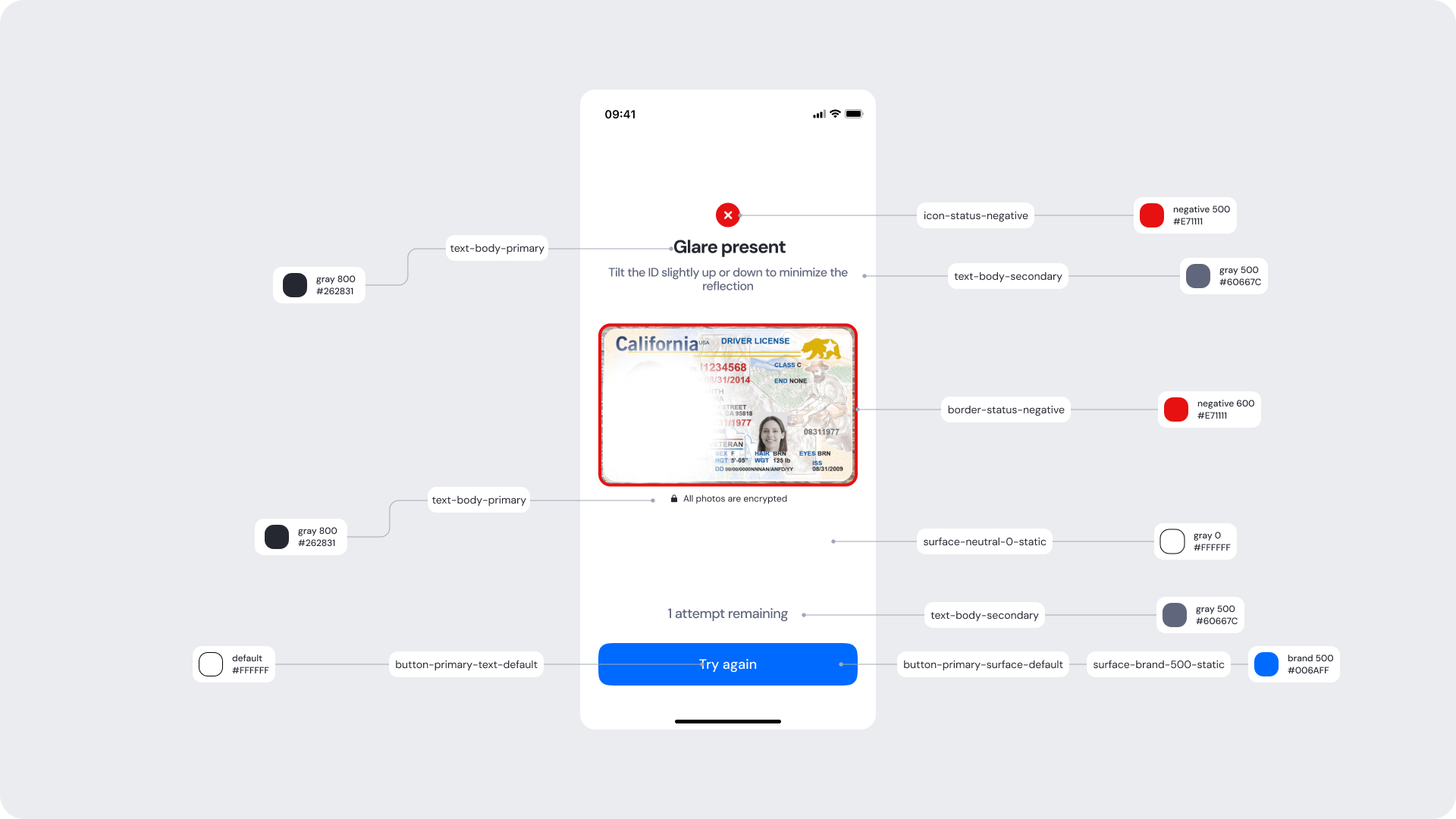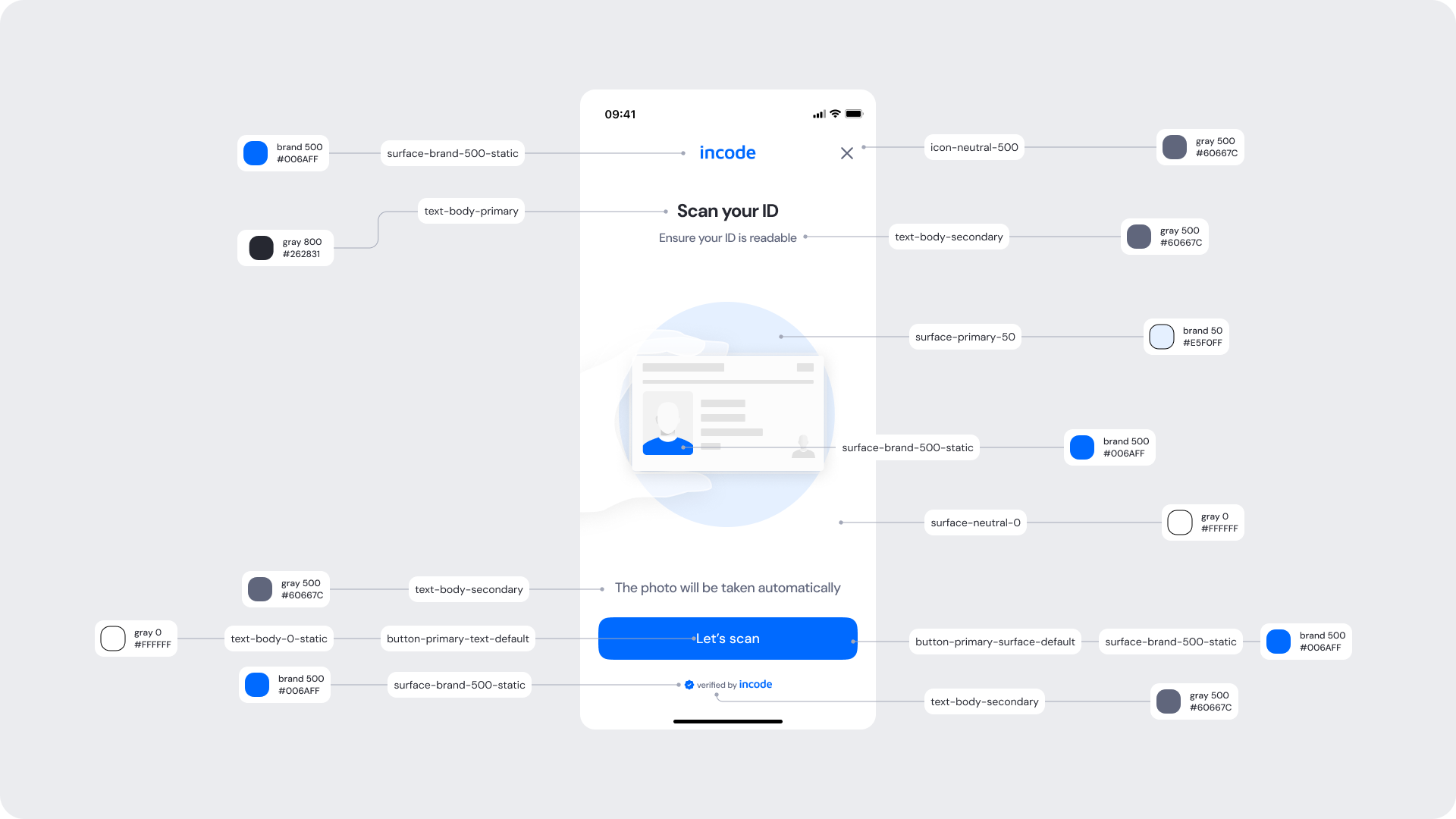 | Surfaces | Background and card surfaces | Must ensure clarity and contrast against ID image |
