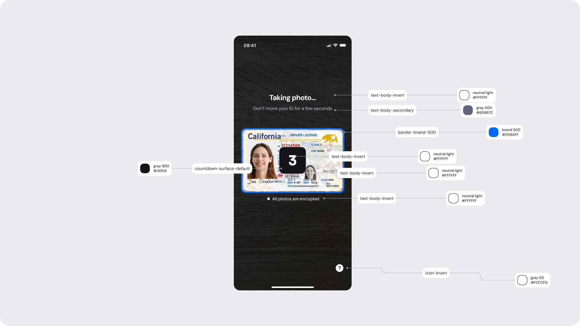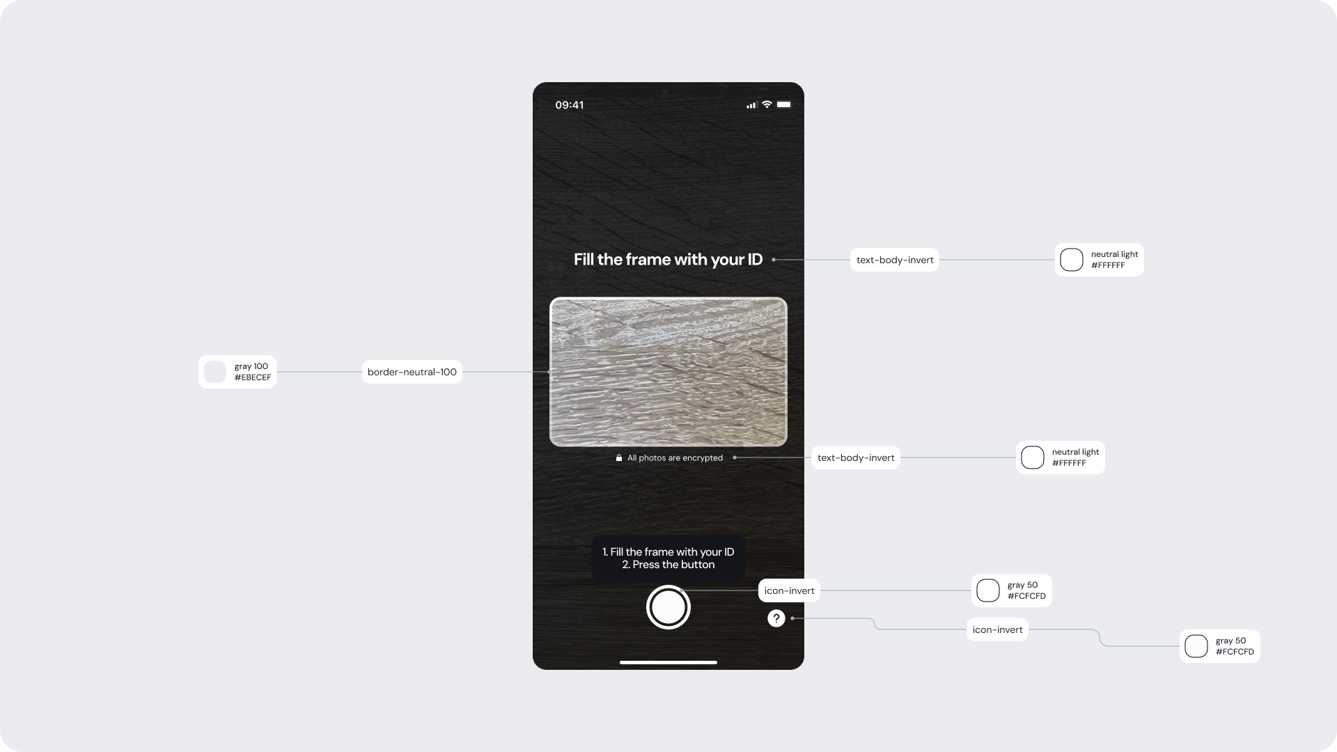 | Instruction text (“Fill the frame with your ID”) | text-body-invert | #FFFFFF |