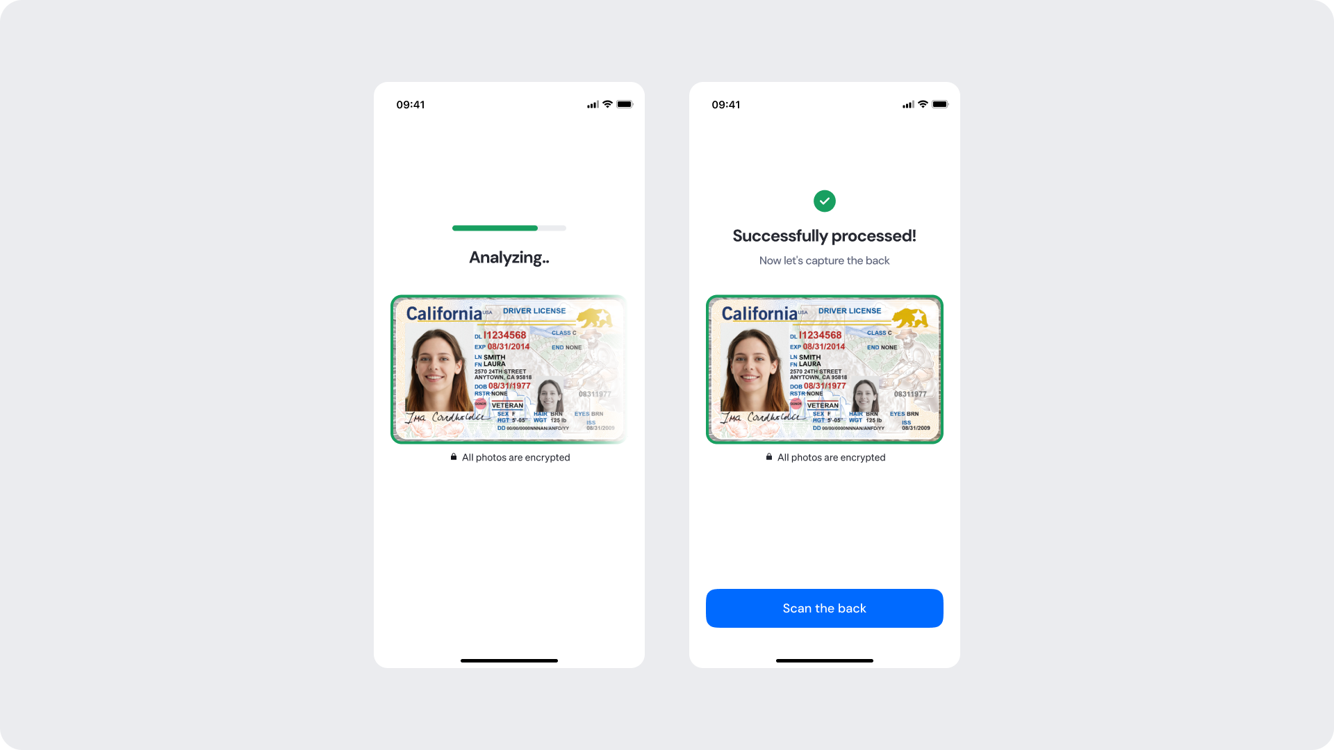 Once the ID photo is captured — either automatically or manually — the user transitions to the Analyzing and Success screens. These stages reassure users that their ID is being securely processed and confirm when the image has passed all validation checks. Both the progress indicators and confirmation visuals can be adapted to match your brand identity..