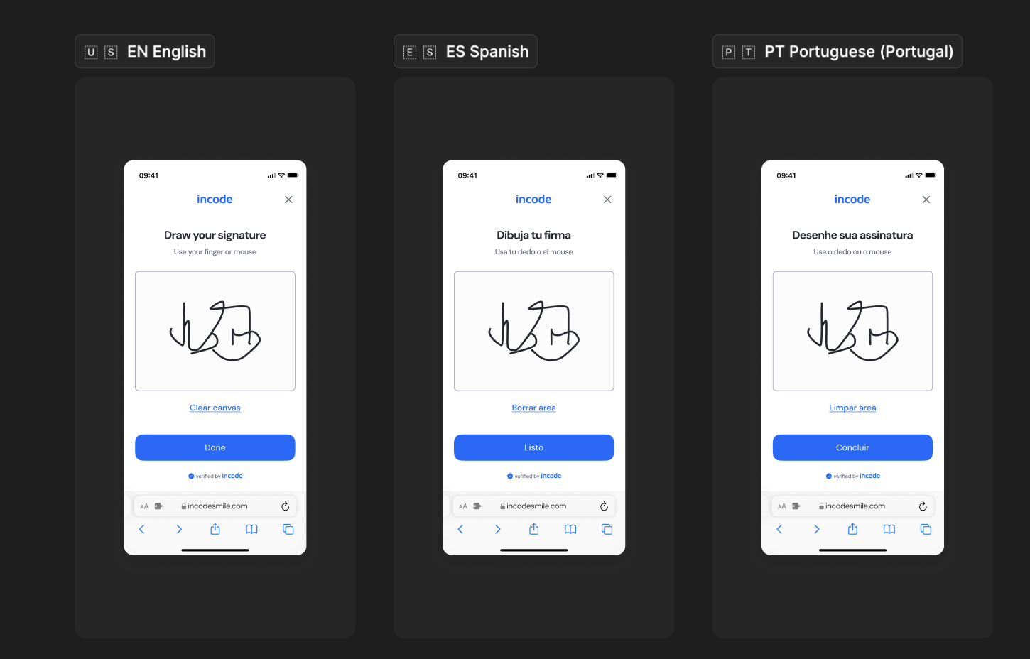 The Electronic Signature module supports full localization and is designed to adapt to languages with different lengths, line breaks, and reading patterns. The Figma file includes examples for long, short, and multi-line translations to ensure layouts remain stable across regions.