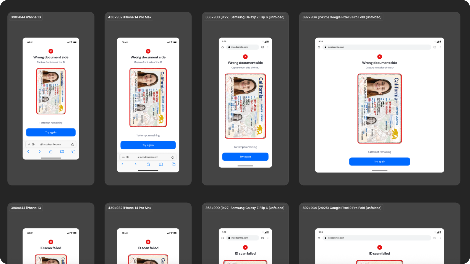 The ID Capture module is fully responsive and adapts seamlessly to a wide range of device sizes and aspect ratios. The layout is designed to remain consistent and predictable whether the user is on a small phone, large phone, foldable device, or tablet.