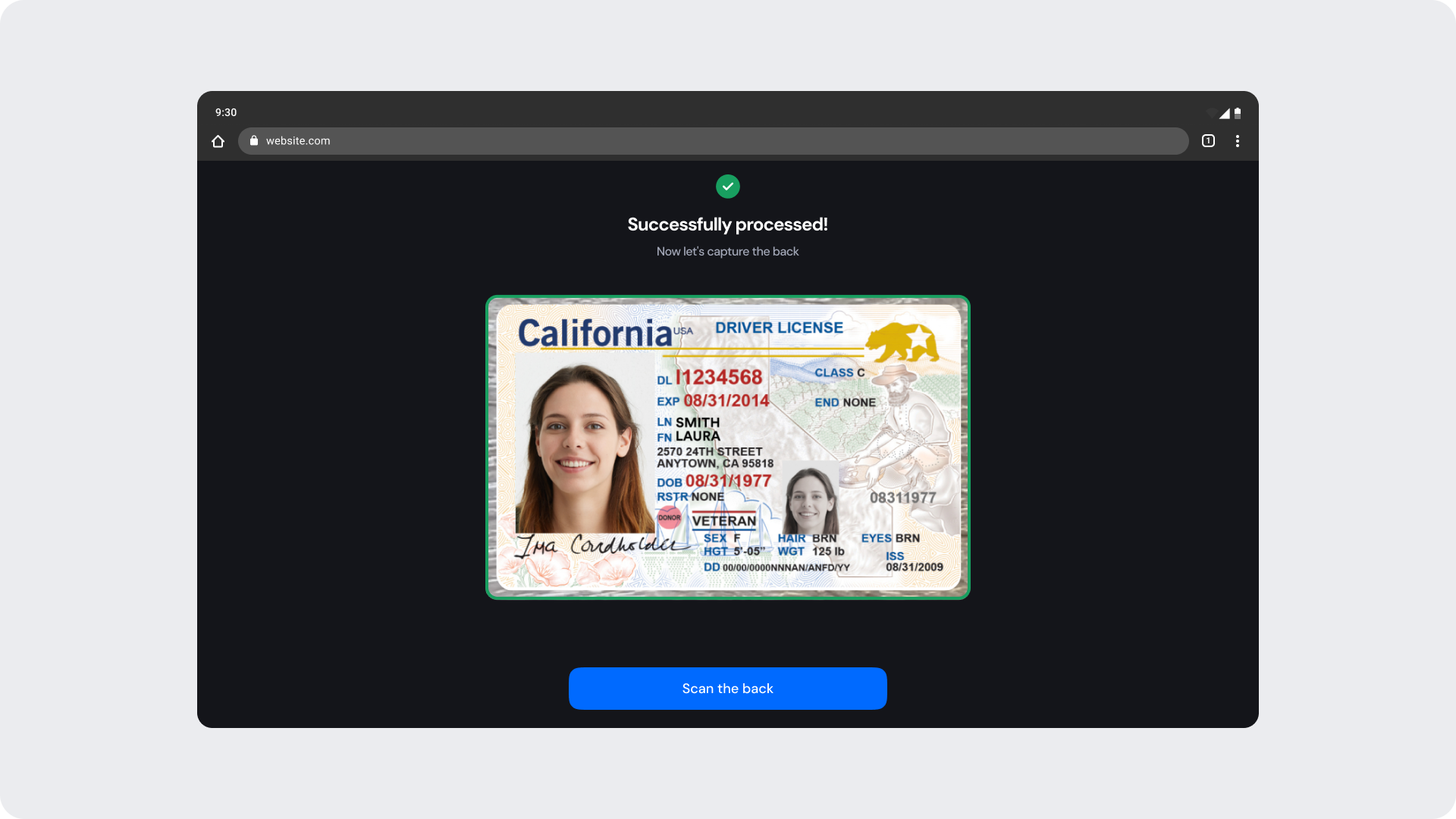 In desktop and tablet environments, the ID frame automatically scales to preserve the document’s proportions and maintain detection accuracy. Spacing, typography, and button placement adjust to wider layouts, ensuring all key elements—such as the instruction text, capture button, and document preview—remain accessible and visually balanced.
