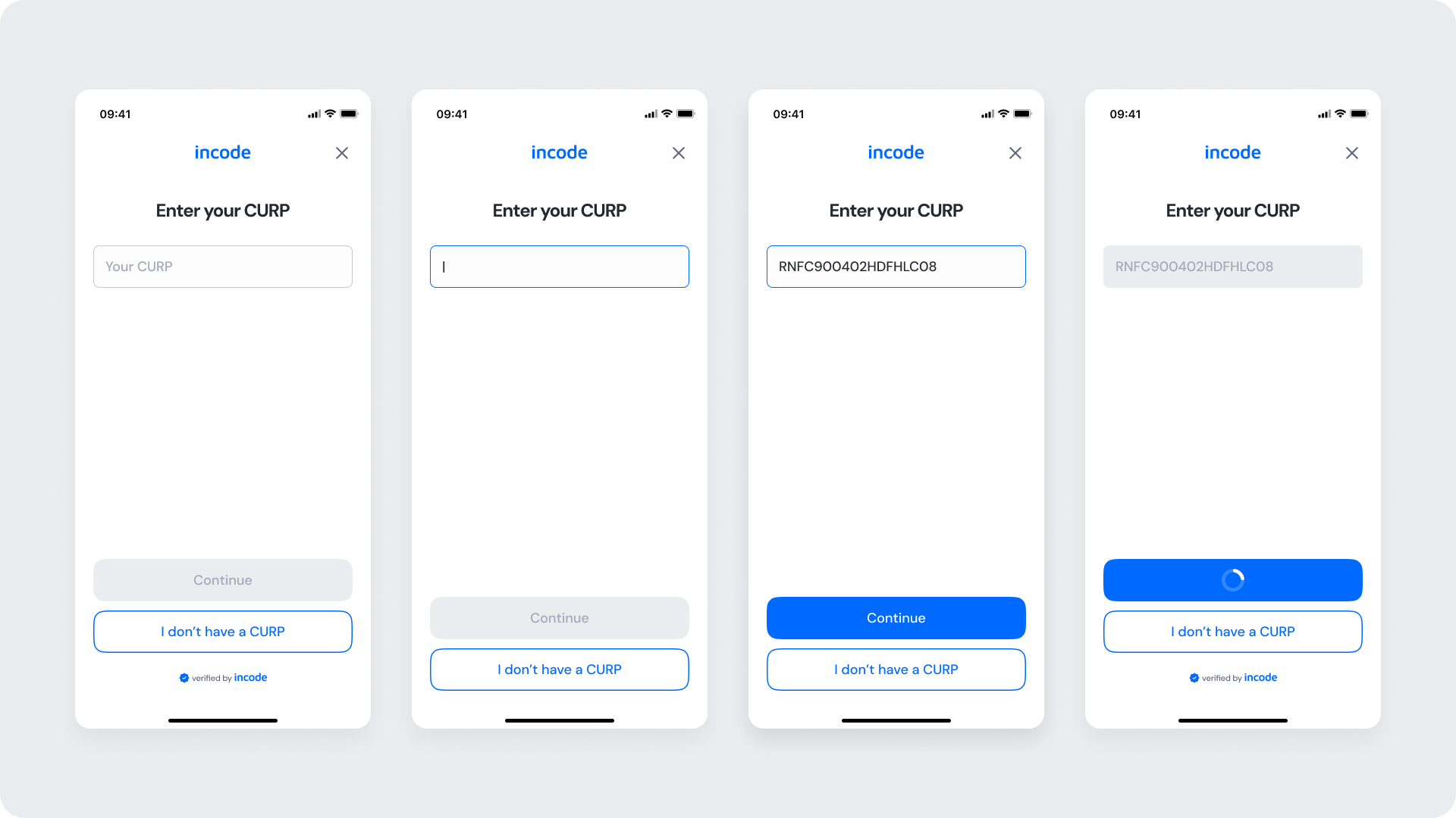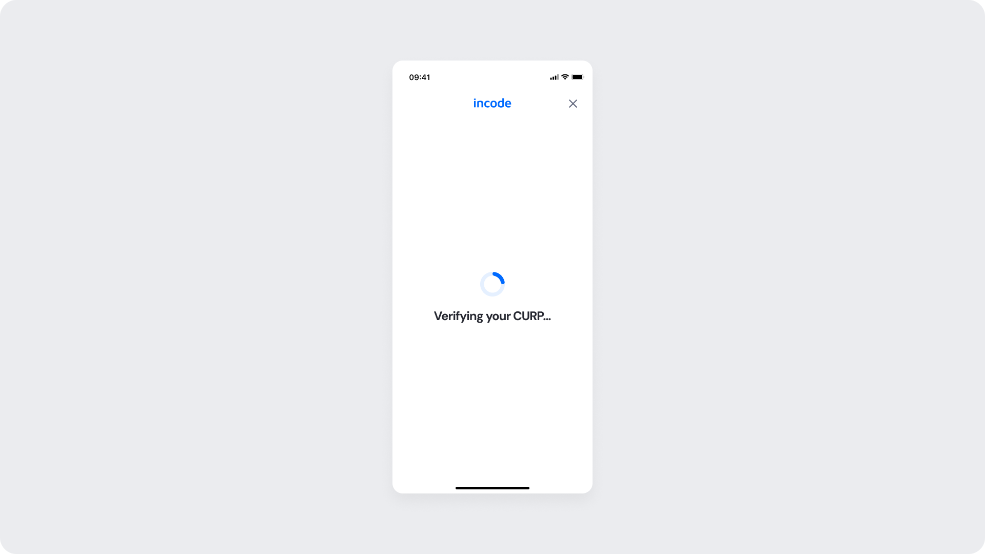 This screen appears after the user submits their CURP. The system validates the provided identifier and displays processing state while verification is in progress.