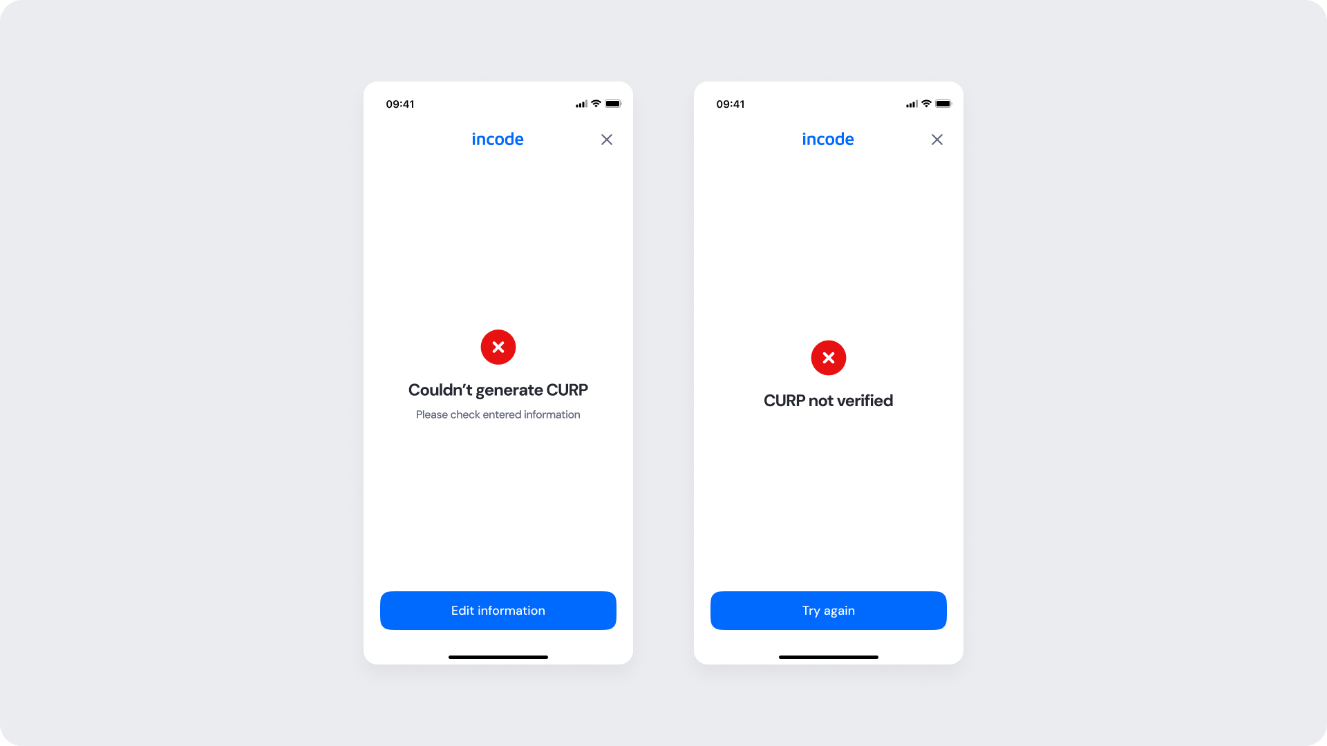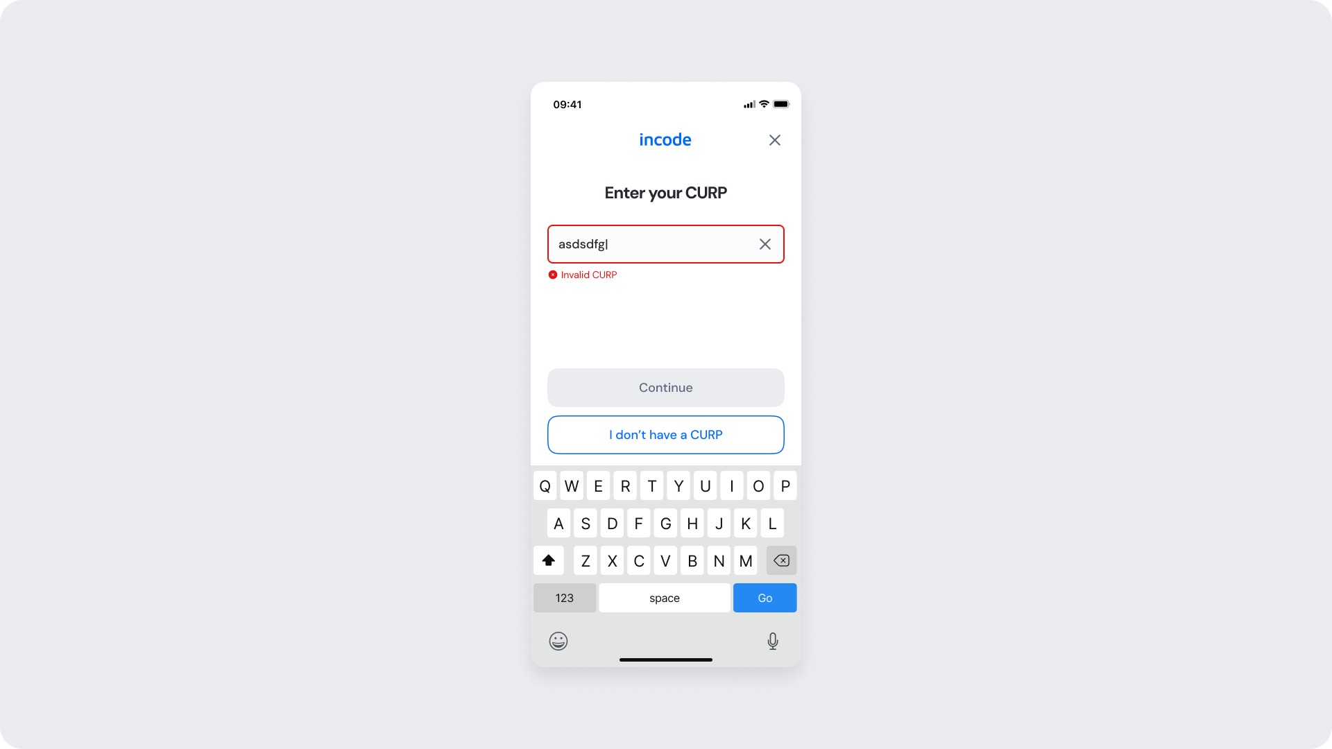 Displayed when the entered CURP is invalid or doesn't match the expected format. The user receives immediate feedback and can correct the input.