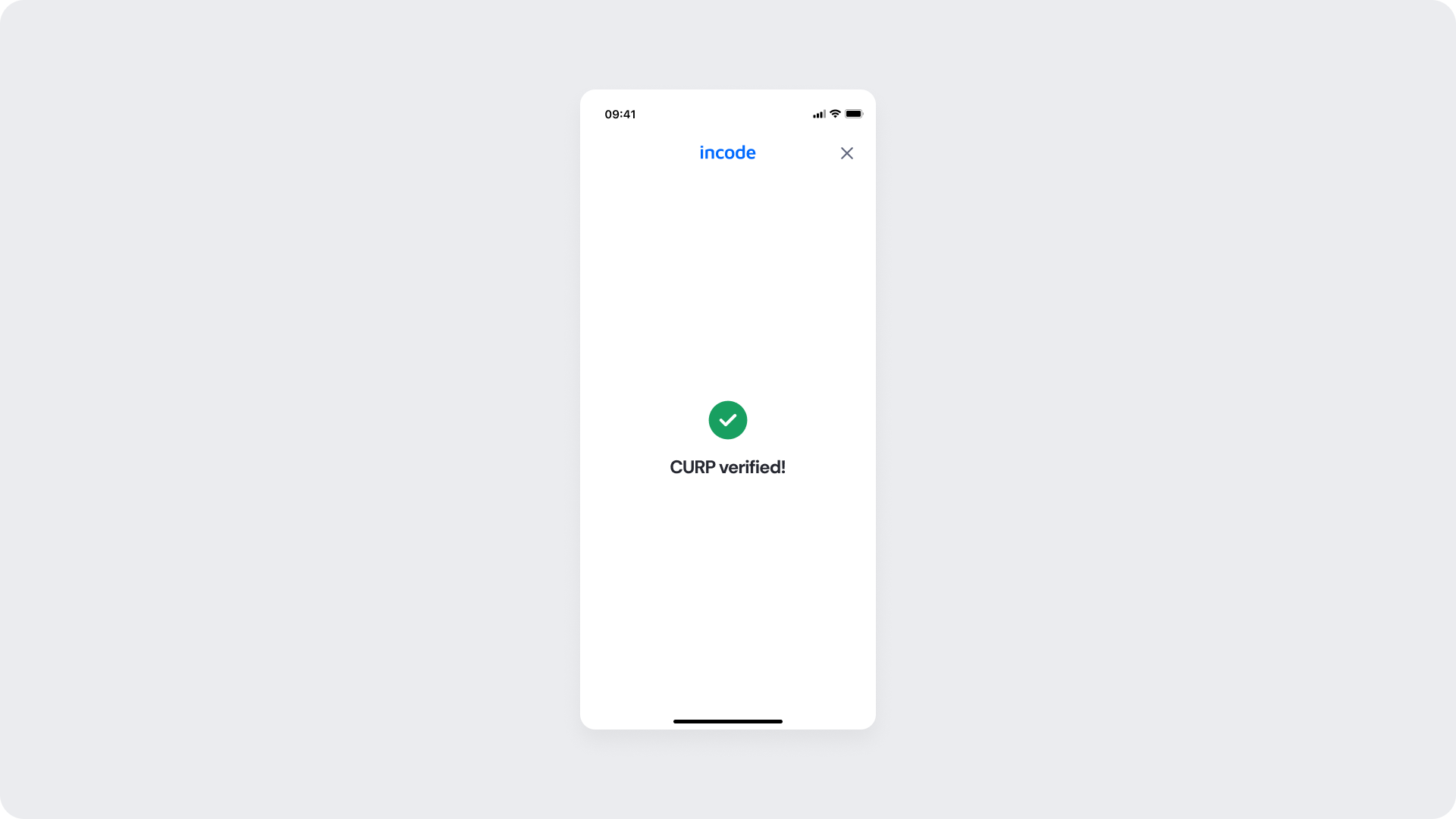 Displayed when the CURP is successfully verified. The user can proceed to the next step in the onboarding or identity flow.