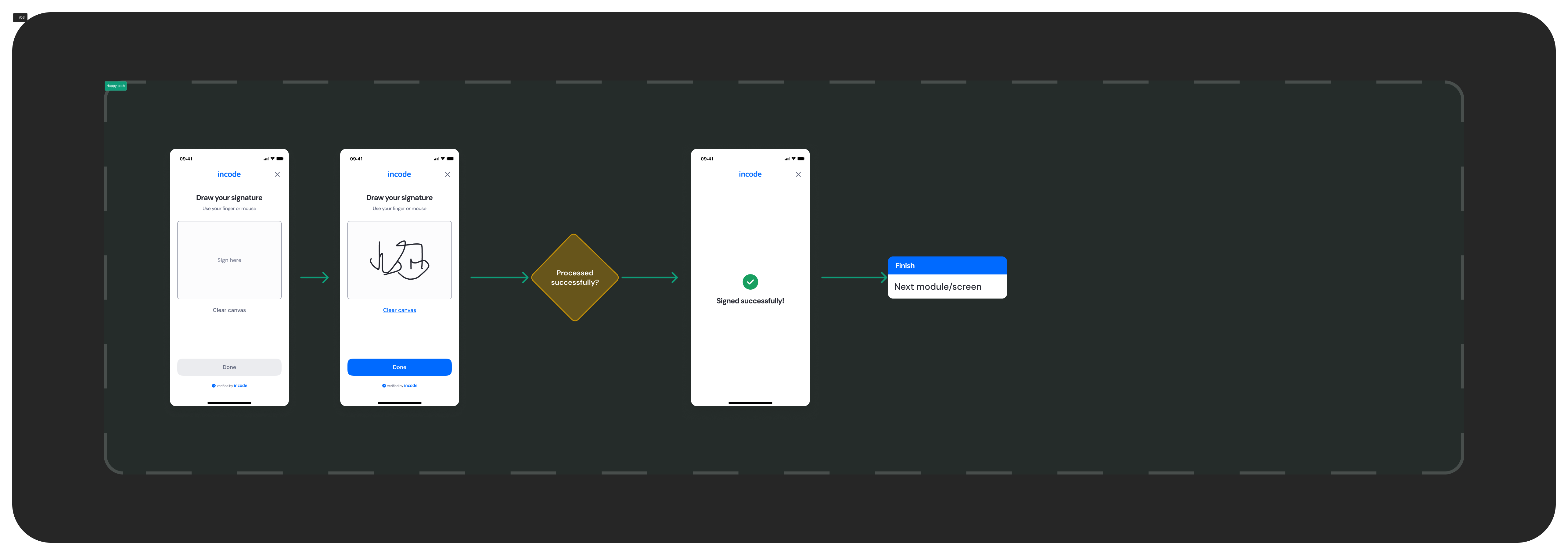 The happy path represents the smoothest version of the experience: the user draws their signature on the canvas, reviews it, taps "Done," and the system captures and confirms the signature on the first attempt. The user reaches the success screen without needing to clear and redraw or encountering any errors.
