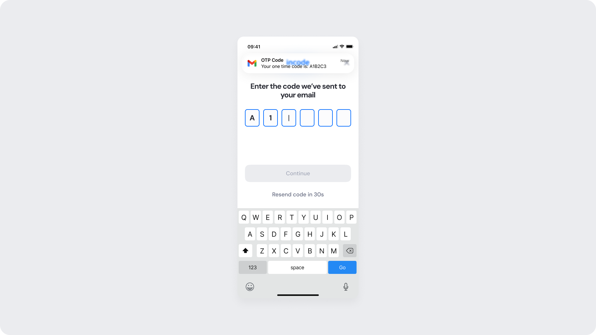 This screen appears after the user enters their email and the system sends a one-time passcode (OTP) to this email.