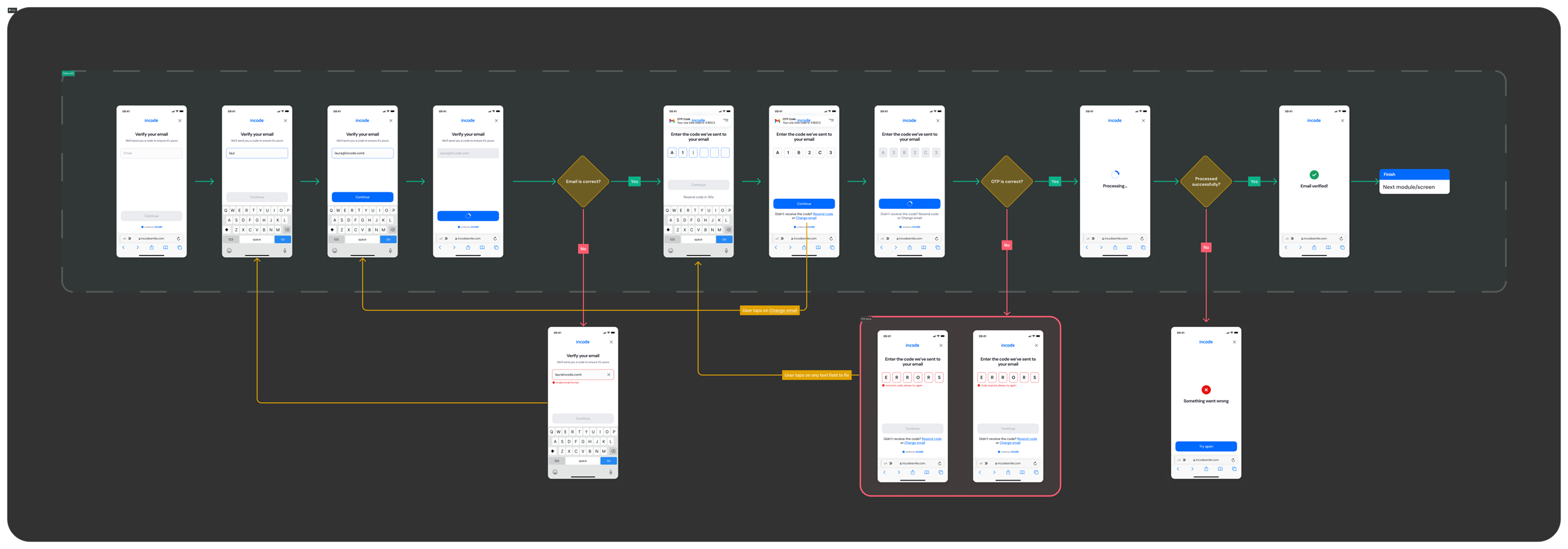 It outlines both the ideal verification path and the alternative user journeys, including error handling for invalid email formats, incorrect codes, network issues, and retry flows. The map visualizes all possible user interactions and system states within the module, ensuring clarity for design, development, and QA alignment.