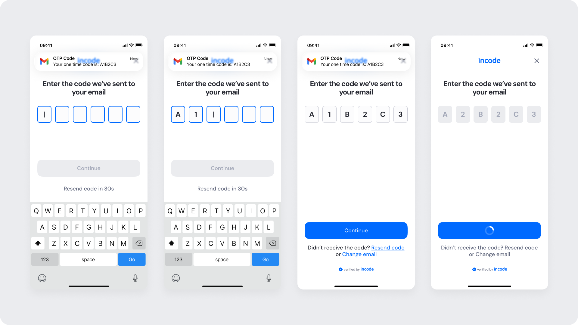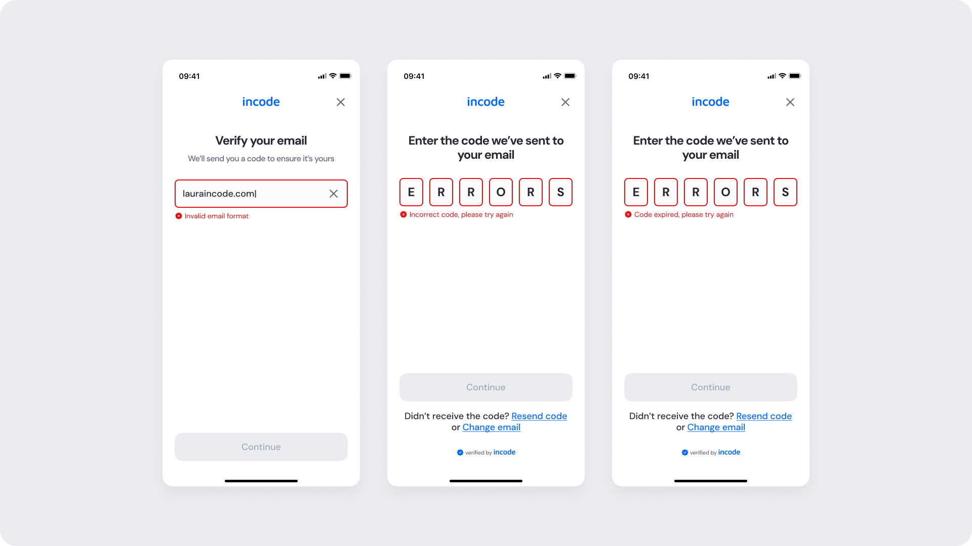 Recovery affordances (Resend code, Change email) remain visible. Copy is intentionally brief to avoid over-explaining and reduce the risk of aiding malicious testing.