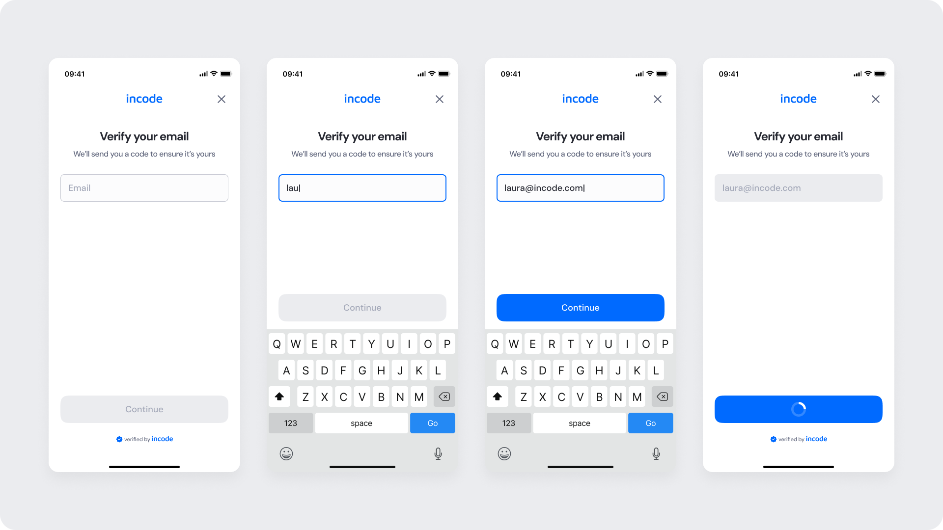 Guides the user from an empty field to a valid email and into submission. The Continue button is disabled until a valid format is detected; it activates once validation passes. While submitting, the button shows a loading state to prevent duplicate requests.