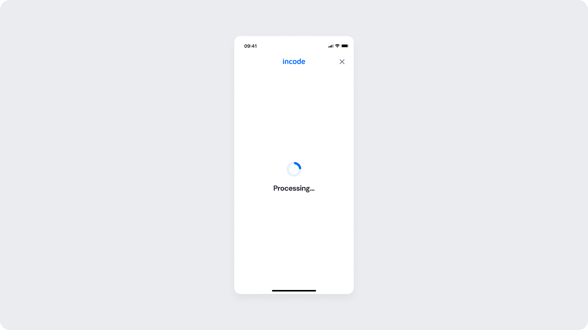 A short step after the OTP is submitted. Spinner + status text communicates progress while preventing multiple submissions. This state should be brief and non-interruptible (except for closing the module, if allowed by host app).