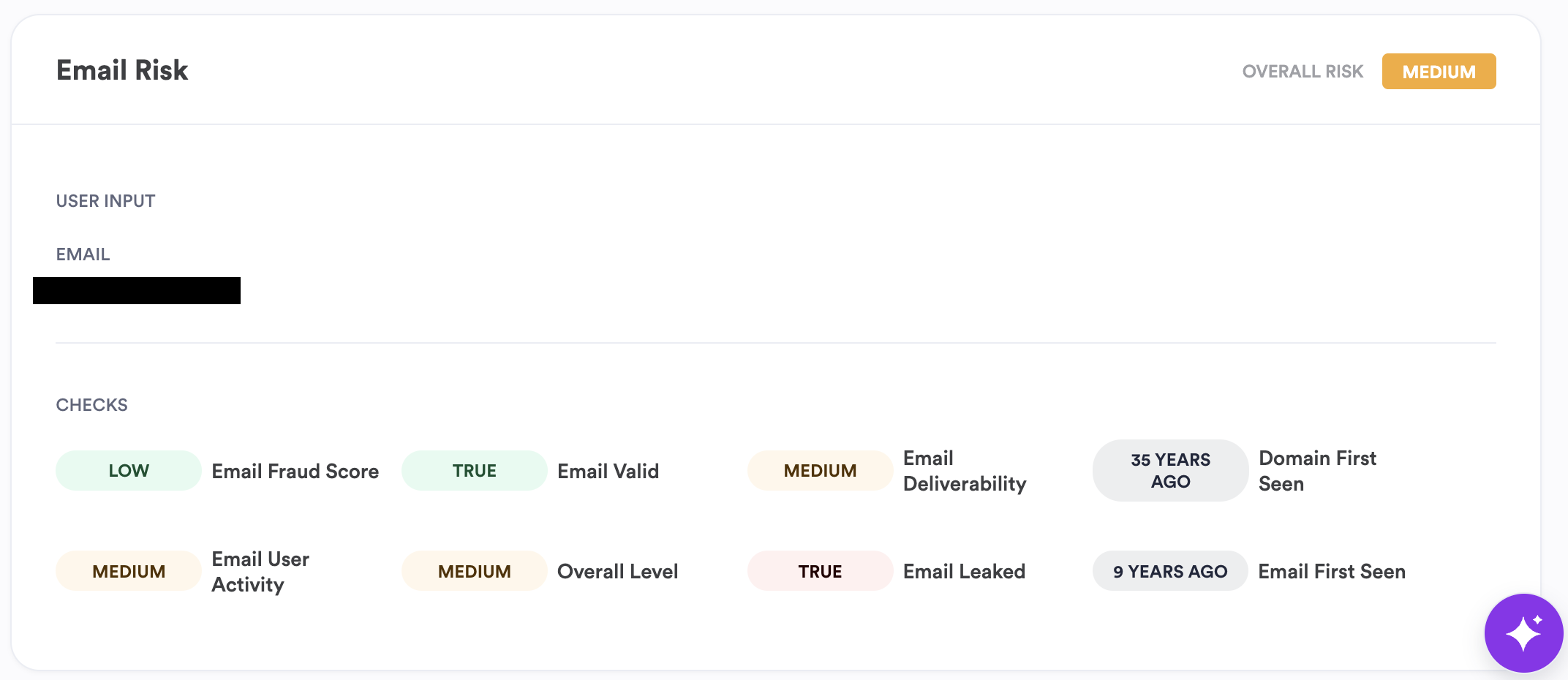 emailUserActivity | high, medium, low, none | Frequency at which this email address makes legitimate purchases, account registrations, and engages in legitimate user behaviour online. |