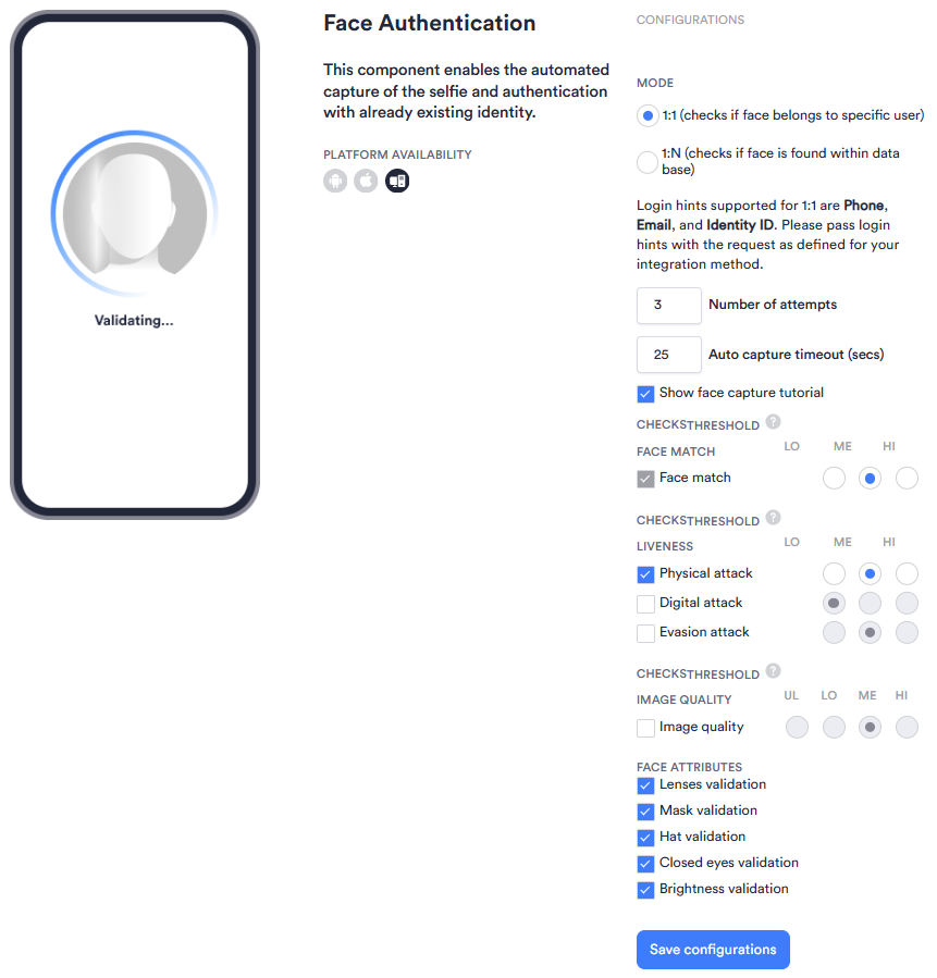 The Face Authentication module enables automated capture of a selfie and authentication with an existing Identity. The authentication can be run in two modes - 1:1 and 1:N.