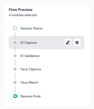Setting Description Identity creation Session Score: Pass If the session ends with Pass, you can Approve Identity creation or Send to manual review. Click Reset All to remove a selection. Session Score: Warn If the session ends with Warn, you can Approve Identity creation, Send to manual review, or Fail Identity creation. Click Reset All to remove a selection. Session Score: Failed If the session ends with Failed, you can Send to manual review, or Fail Identity creation. Click Reset All to remove a selection. Session completion Optional Mark Verification as Finished On This drop-down allows you to define which milestone should end the Session. You can choose: ID Validation Finished, Face Validation Finished, EKYC Validation Finished, or Government Validation Finished - Customize the User Experience settings.