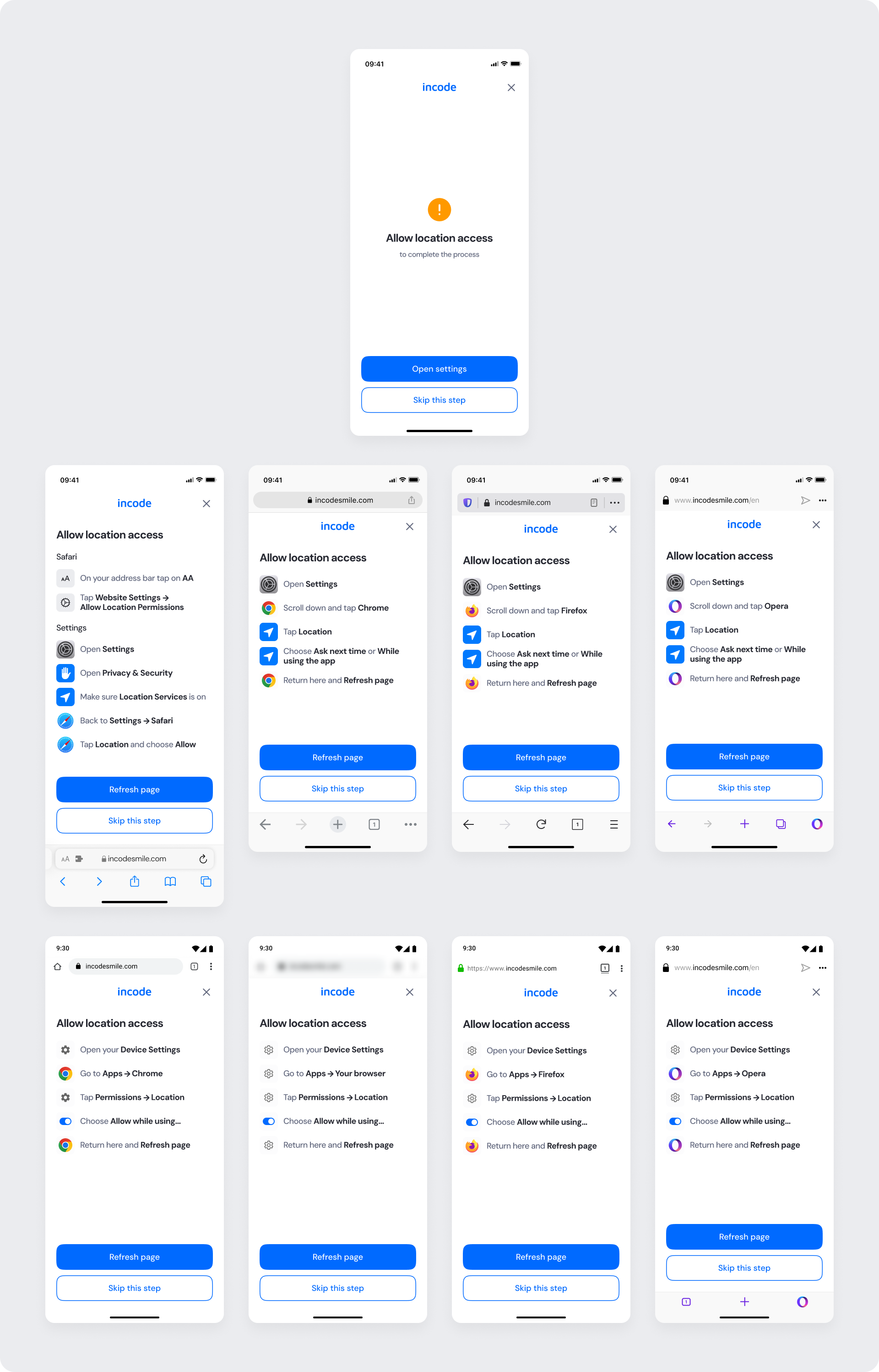 A complete view of all screens the user may encounter during the Geolocation experience. Each state includes a brief description and a direct link to its source in Figma.