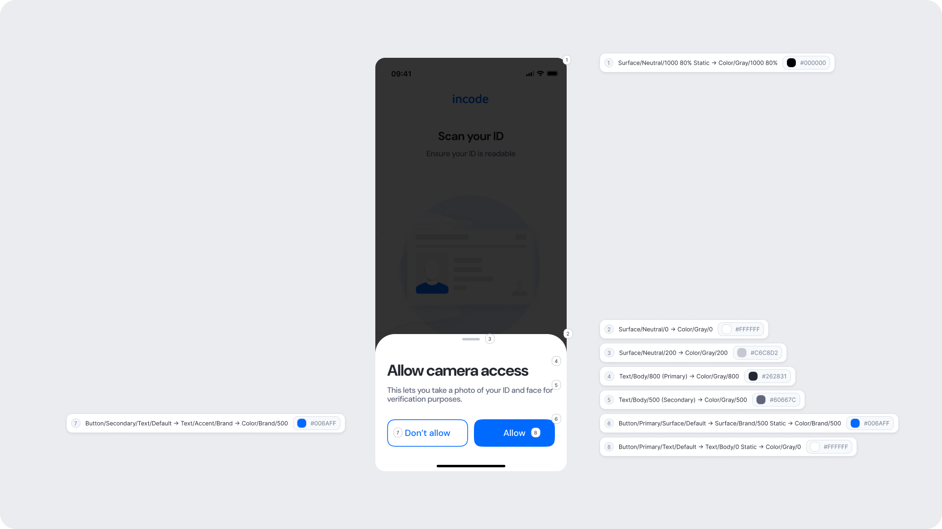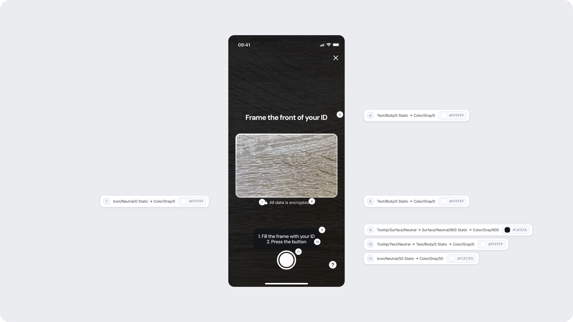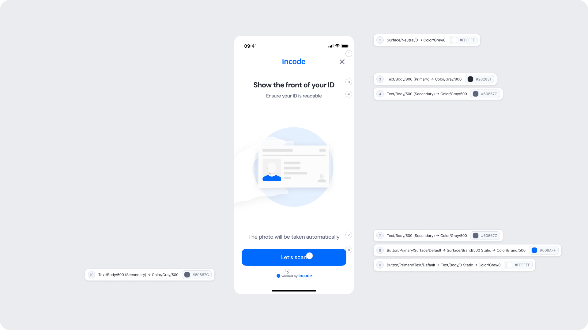 | Surfaces | Background and card surfaces | Must ensure clarity and contrast against ID image |