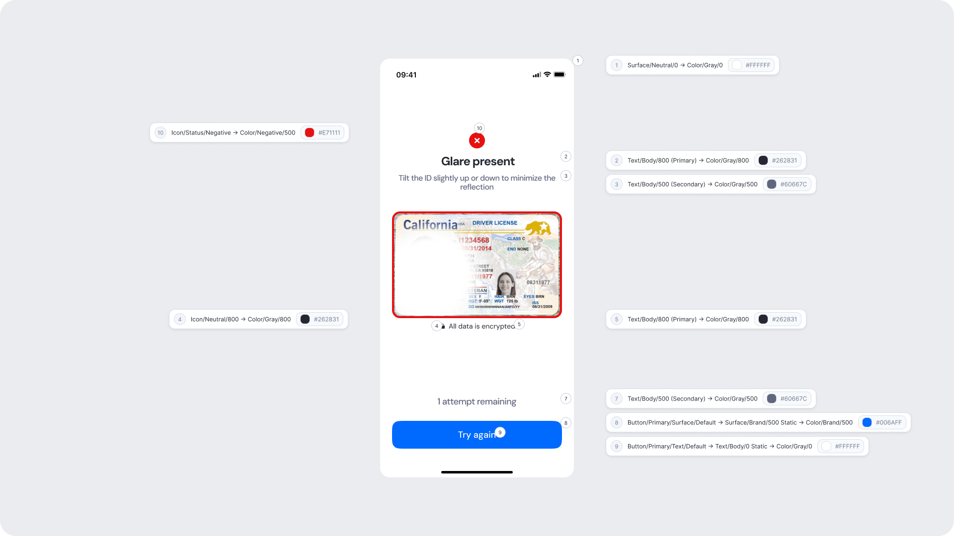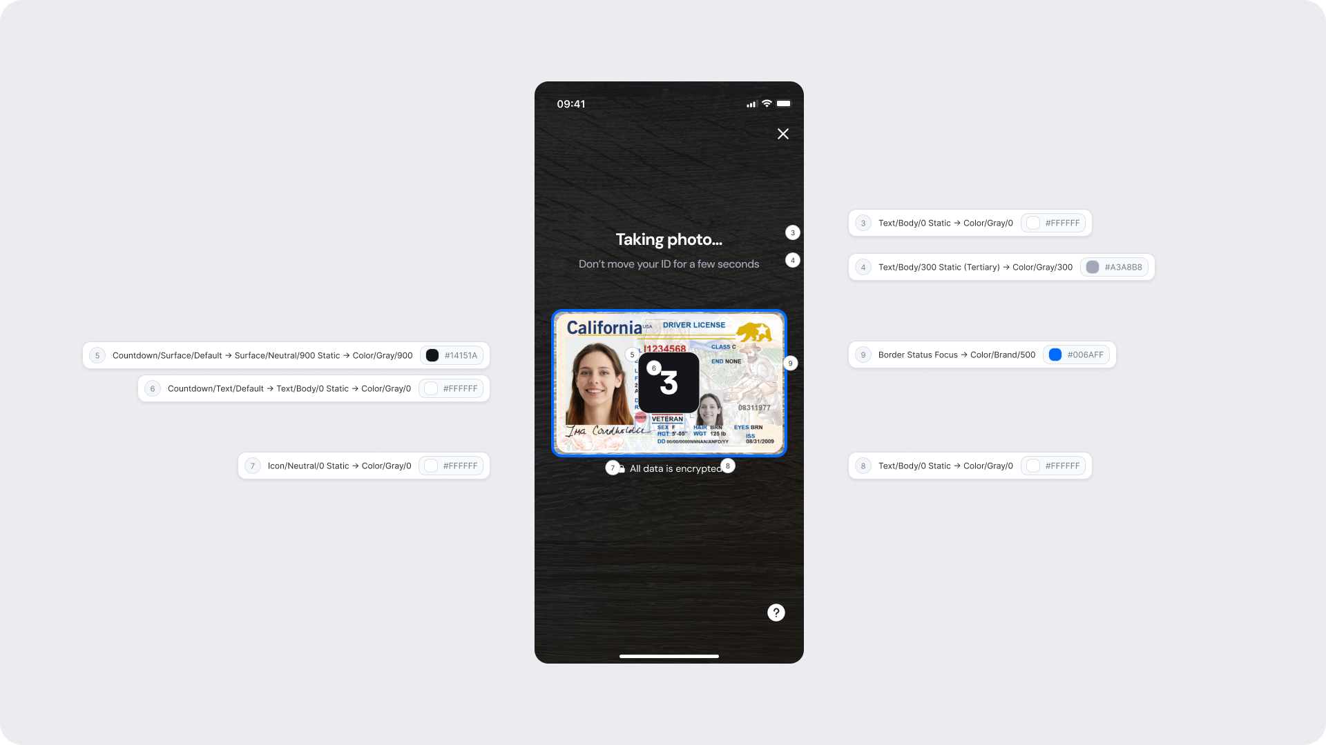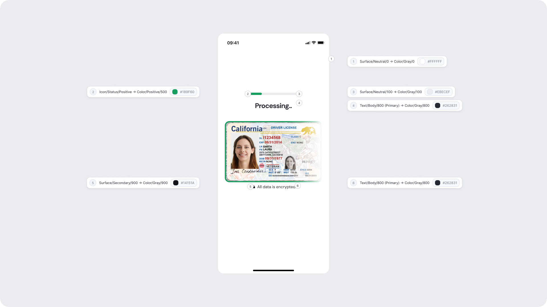 | Surfaces | Background and card surfaces | Must ensure clarity and contrast against ID image |