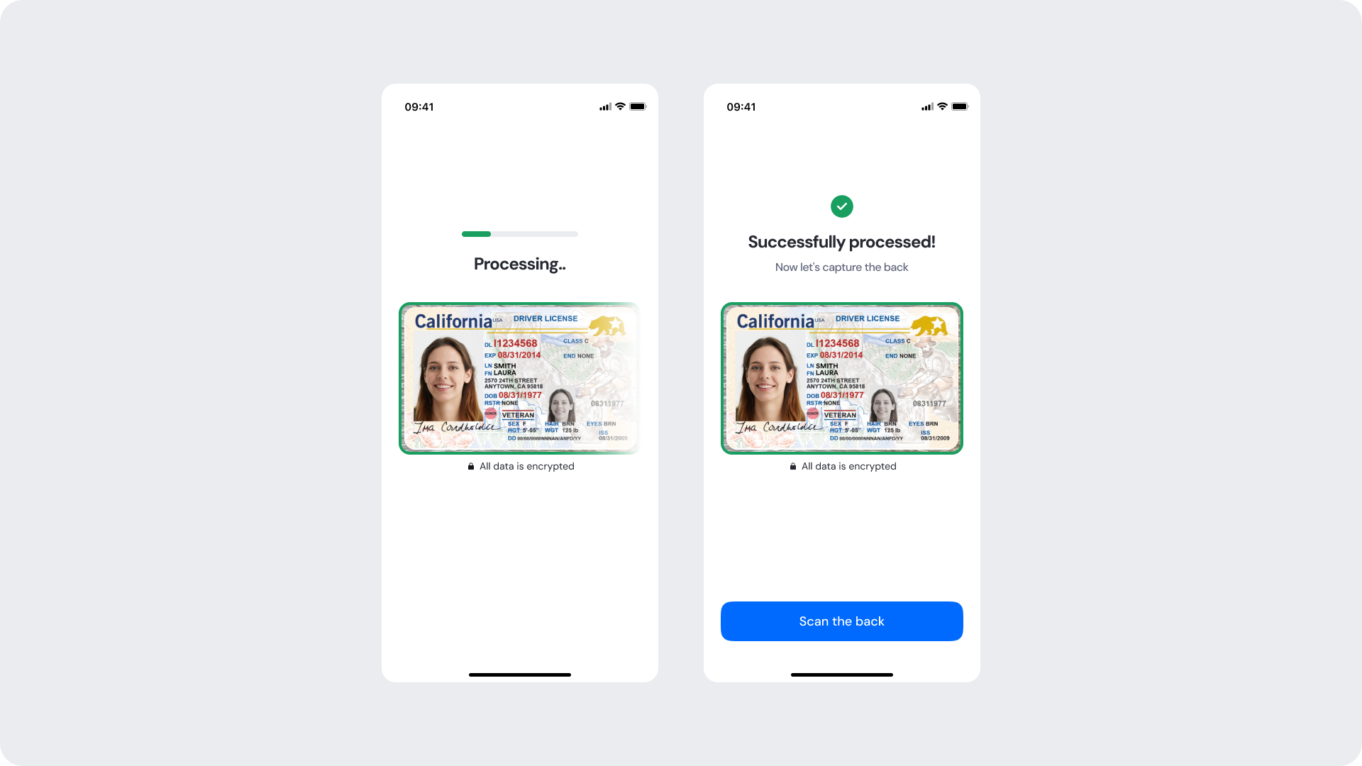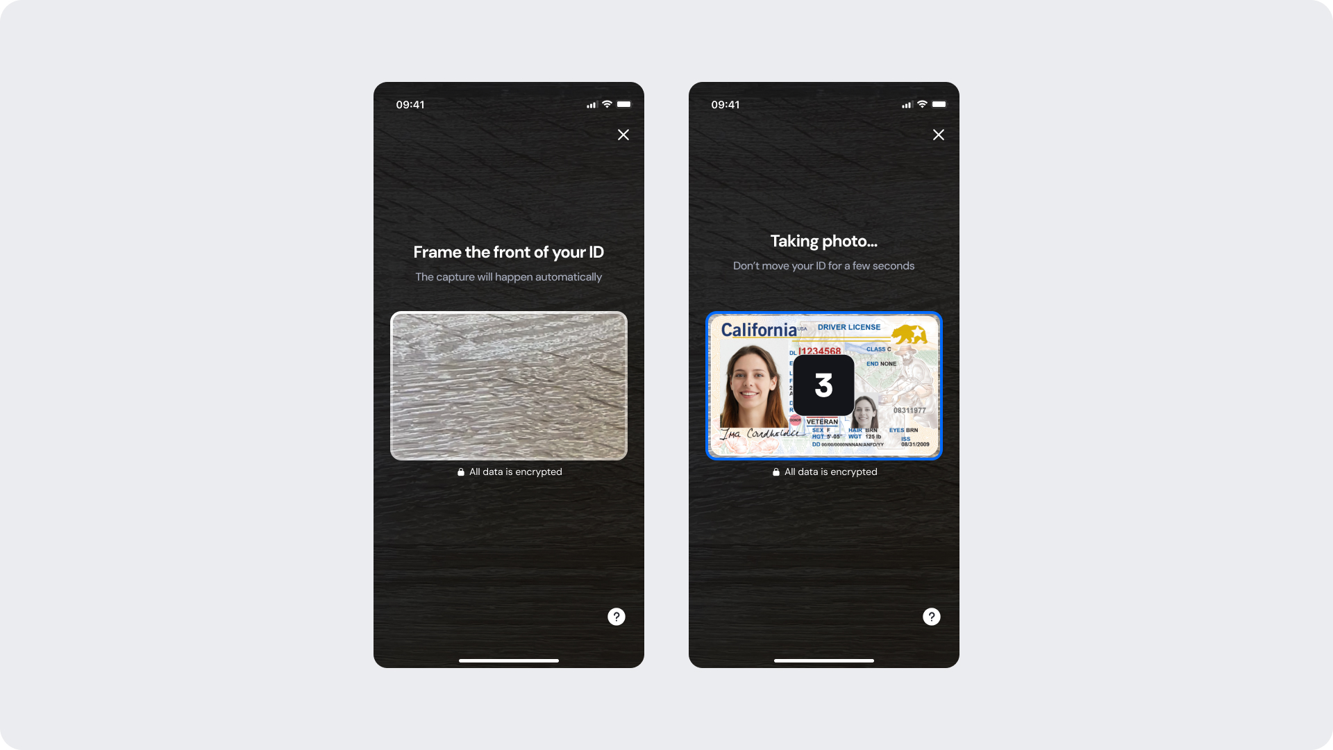 - The ID image always remains centered and visible throughout both stages — never obscured by overlays or text.