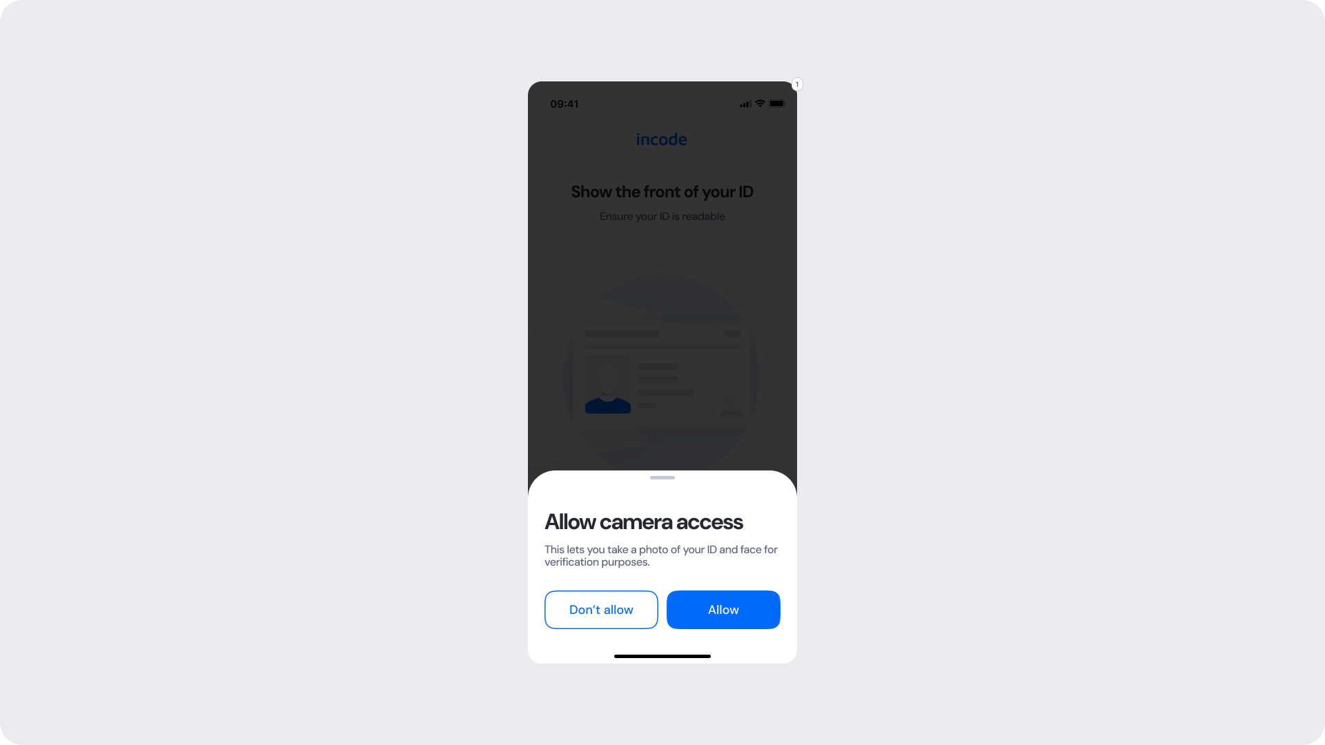 The Fake Permission Screen is shown before the operating system displays its native camera permission modal. It prepares the user, explains why camera access is required, and significantly reduces the likelihood of users denying permission. This step increases trust and prevents interruptions during the ID Capture flow.