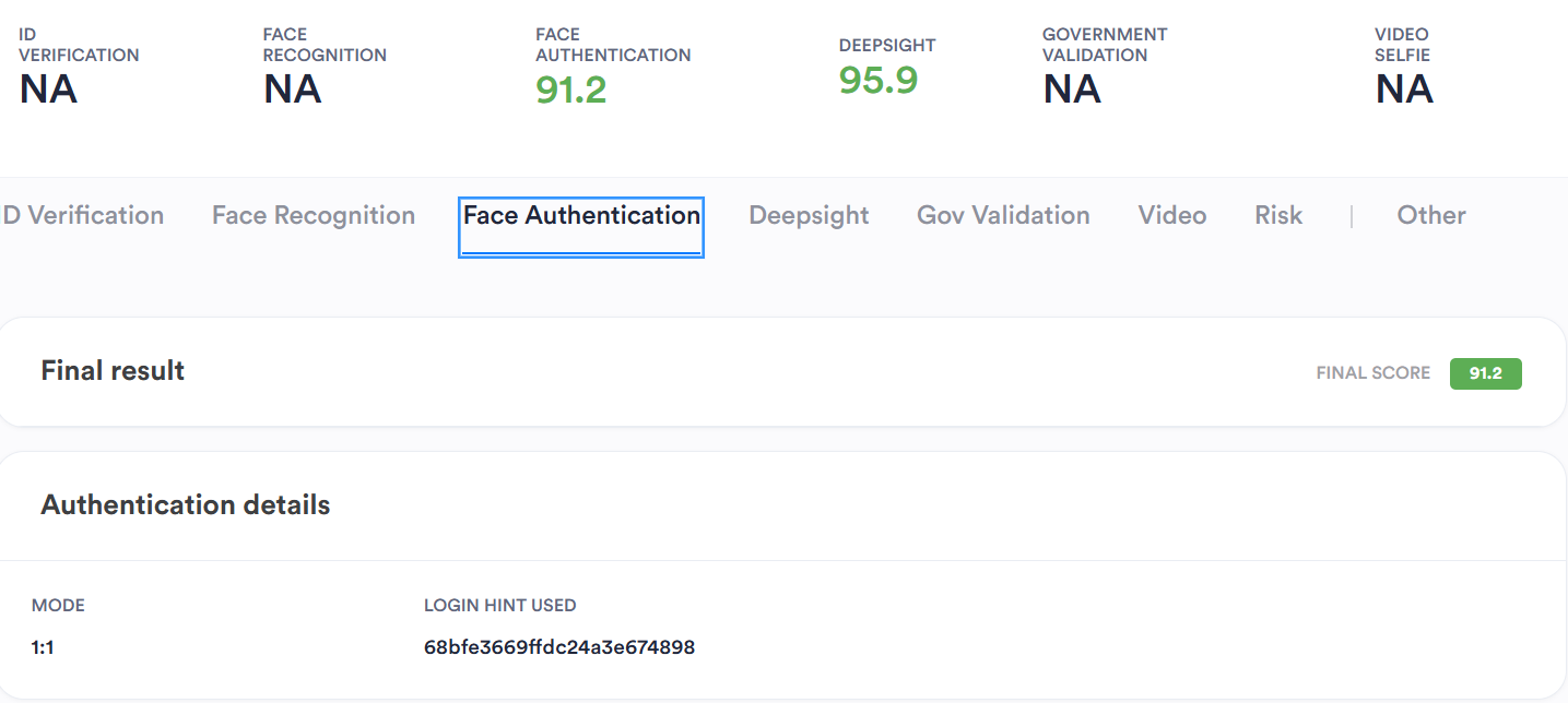 Adding Face Authentication module to the flow will enable an additional tab as well as the face authentication score in the session results. The new tab will contain the information about the authentication including all of the attempt's information.
