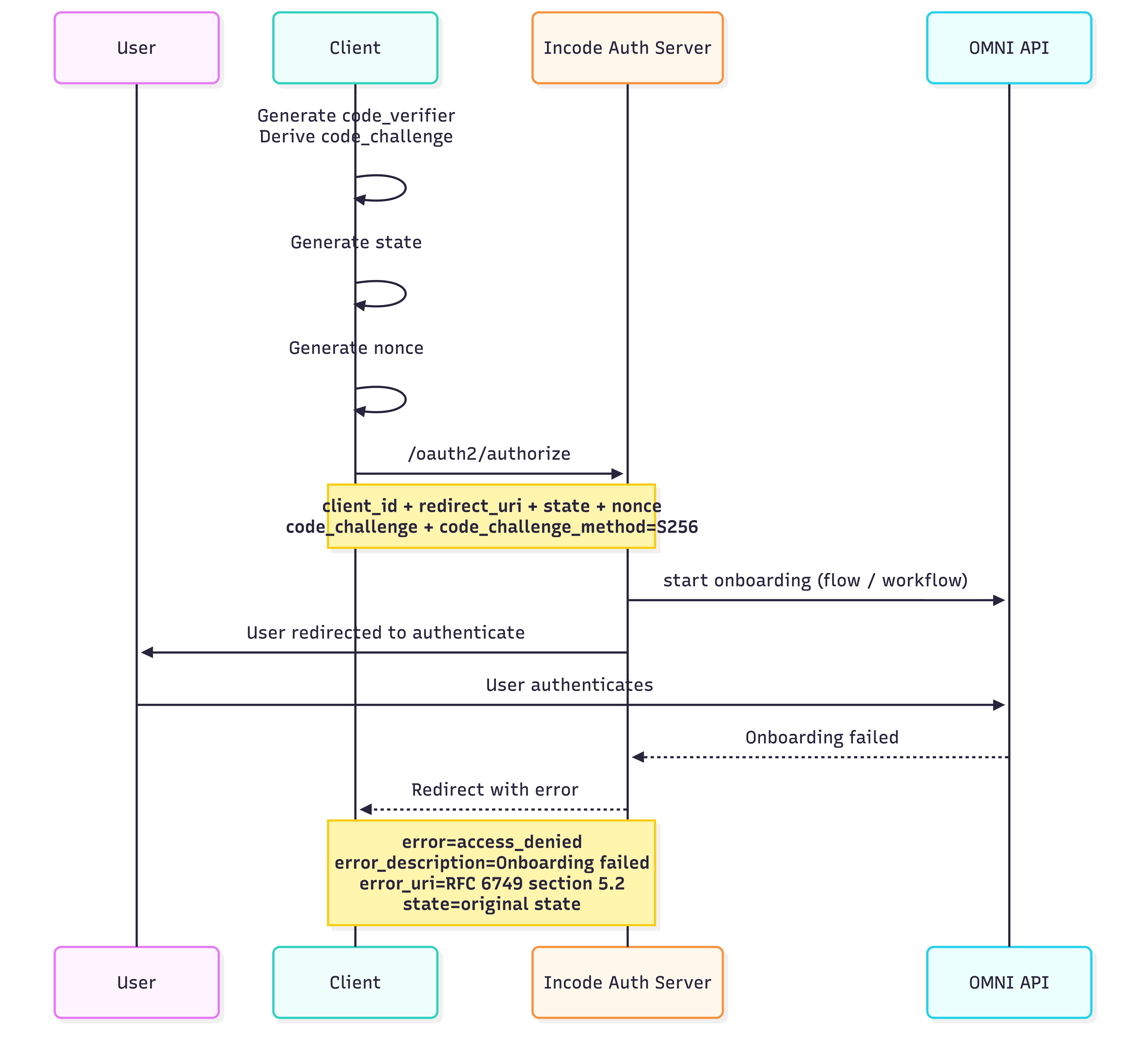 The following diagram shows the sequence of a failed onboarding using OIDC: