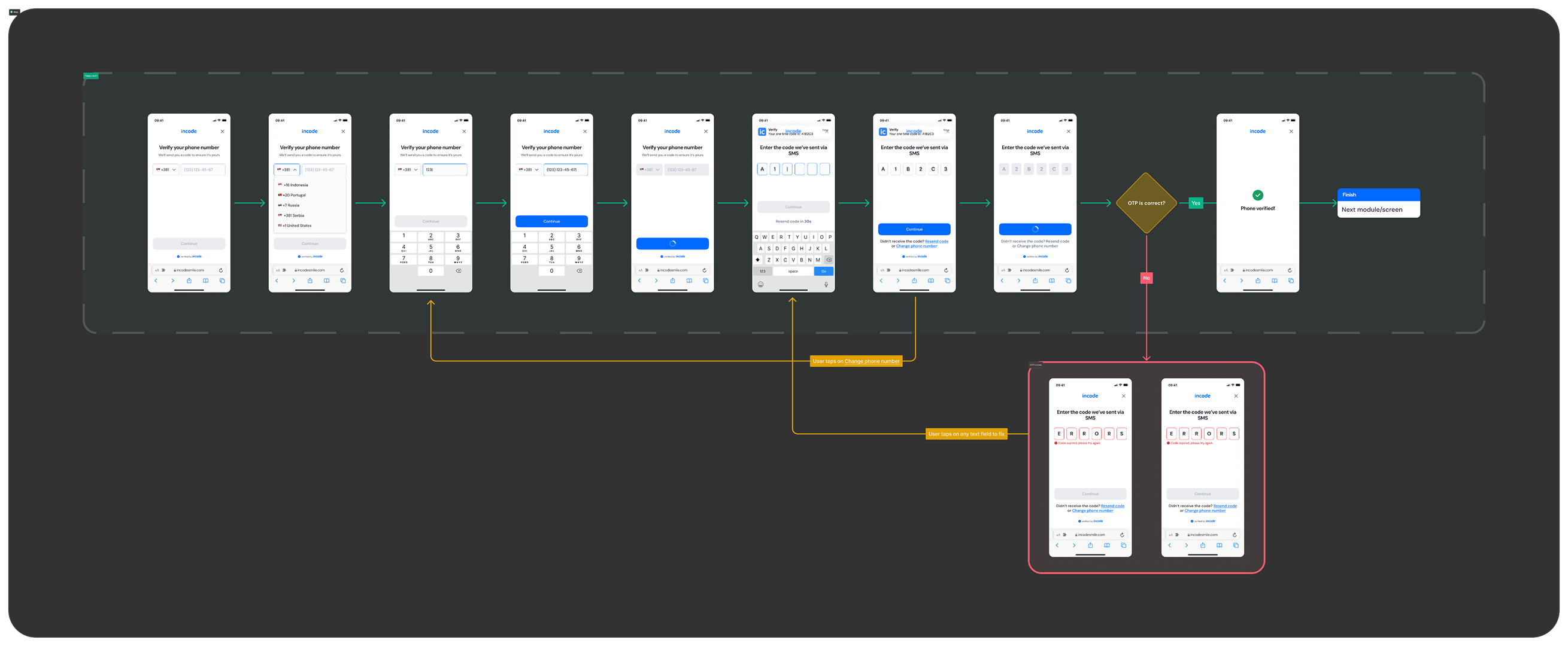 This diagram presents the full sequence of screens involved in the Phone Number Input module — from initial input, country code selection, and OTP entry, to successful verification or error handling.