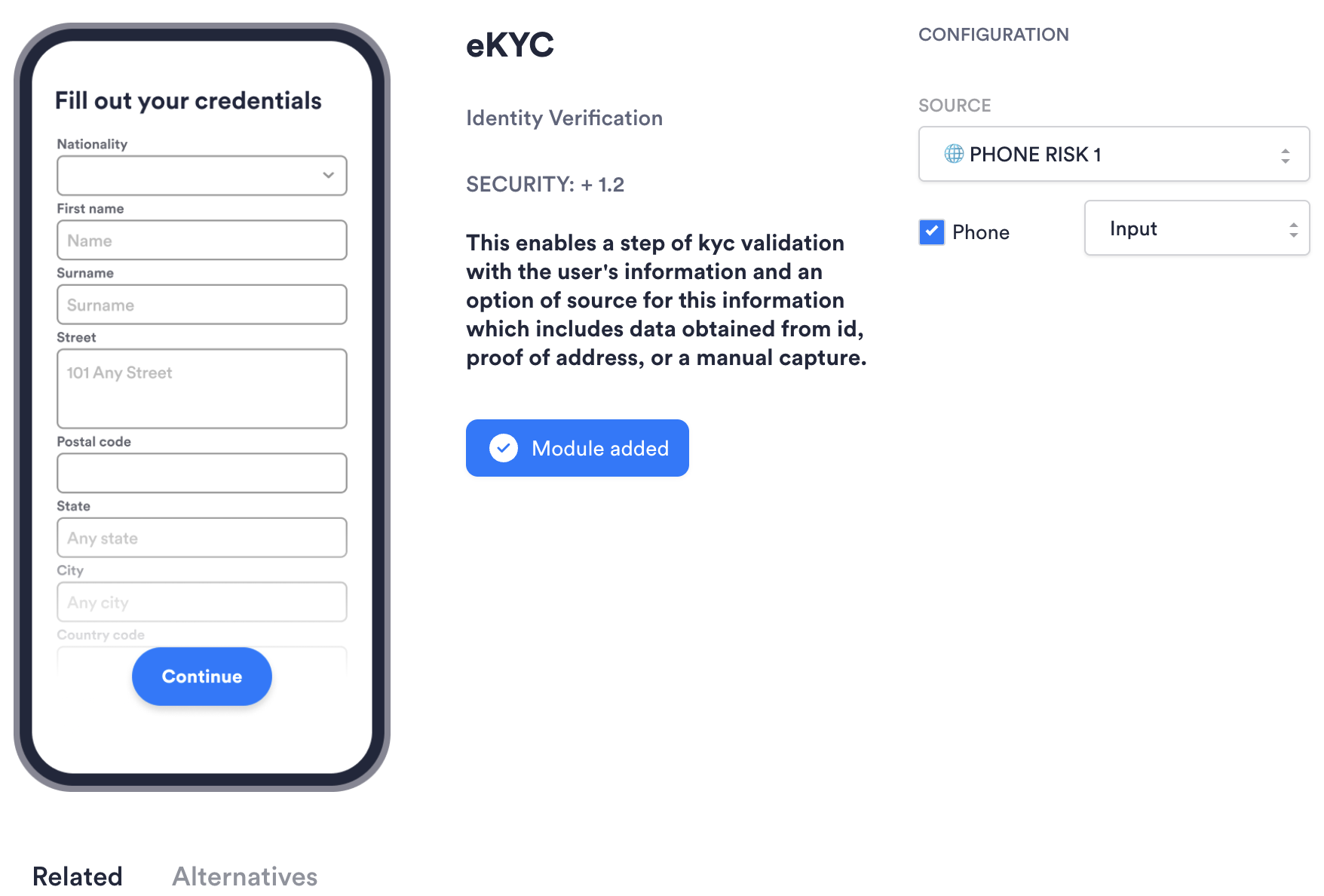 Phone Risk Check module configuration allows collection of user data via a user input flow where users can select the country code and type in their phone number. See an example below: