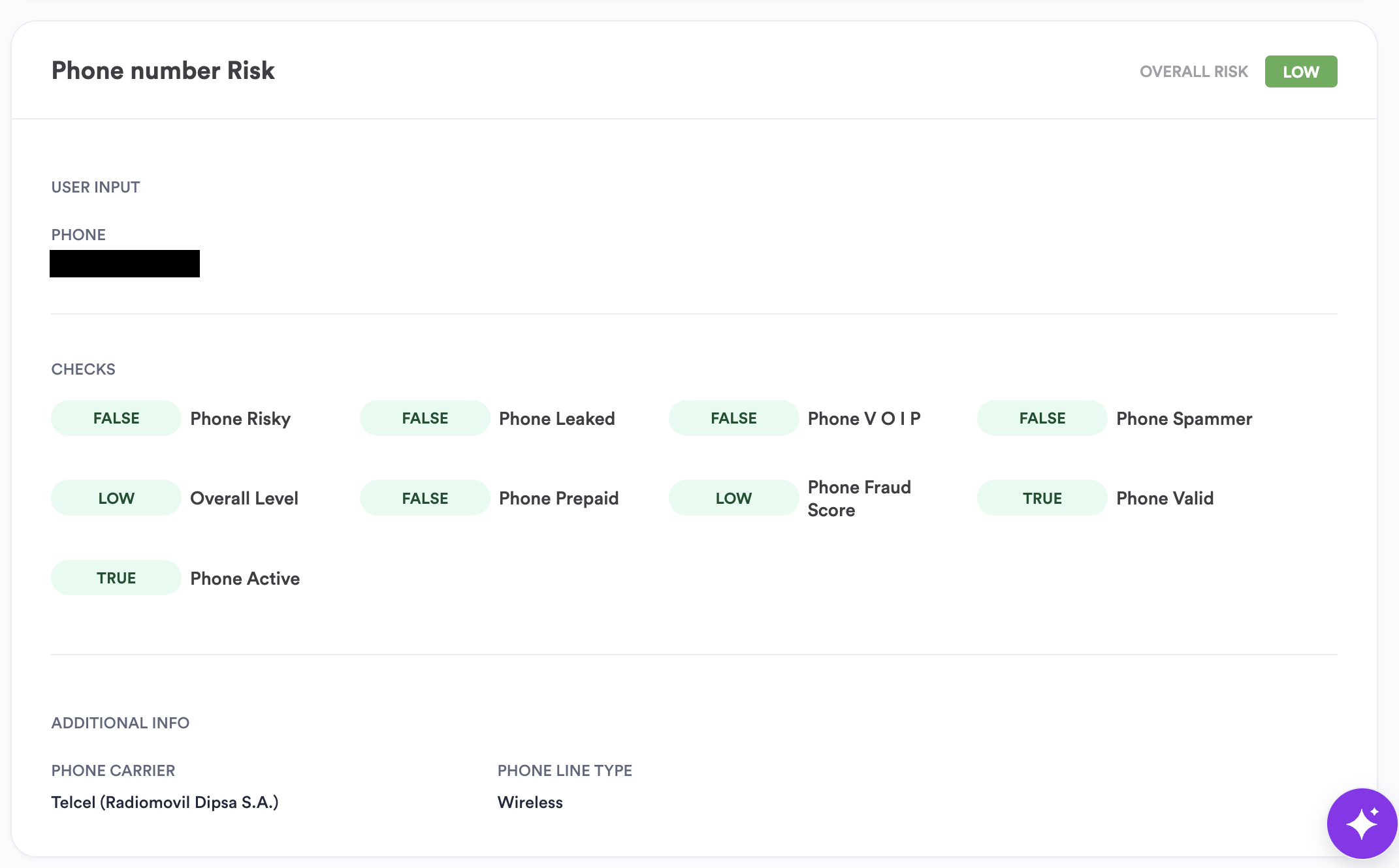 phoneLeaked | true, false | Indicates if this phone number has recently been exposed in an online database breach or compromise. |