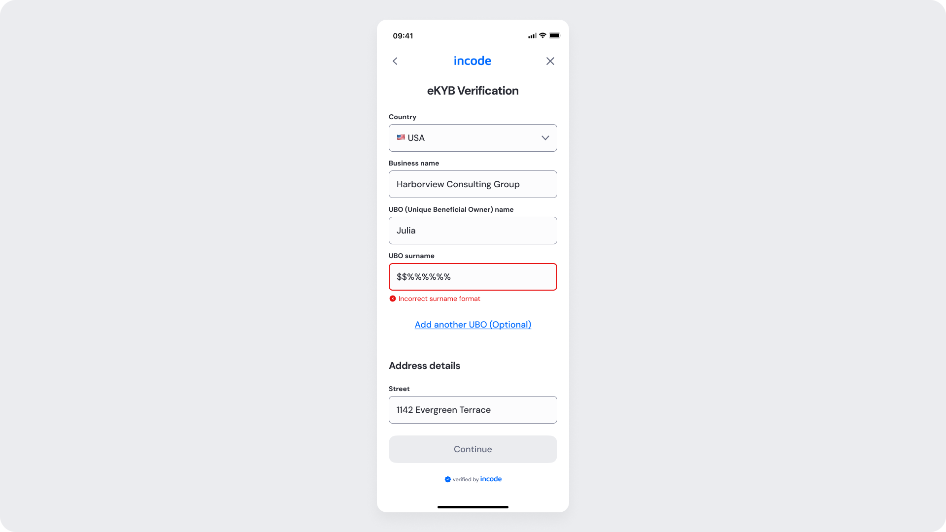 Displayed when one or more fields contain invalid or mismatched data (e.g., incorrect UBO surname).