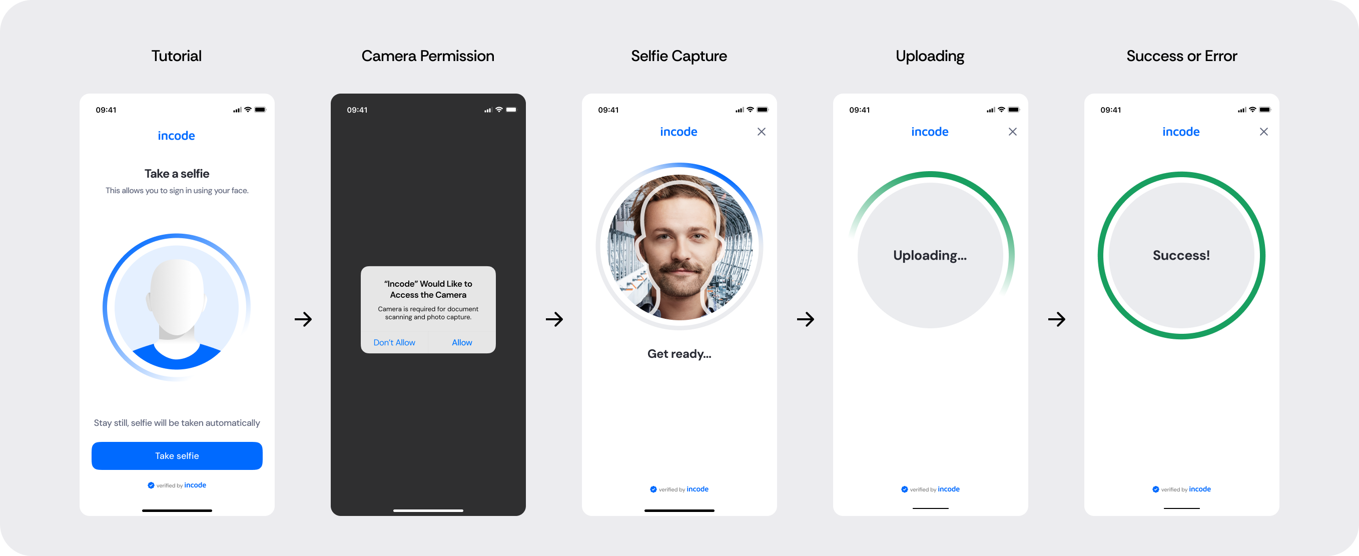 The Selfie Capture experience moves through several clear stages that guide the user from preparation to a successful capture. After granting camera permission, the user is introduced to the process through a short tutorial. When capture begins, the system evaluates alignment, lighting, and facial conditions in real time and triggers an automatic capture once all requirements are met.