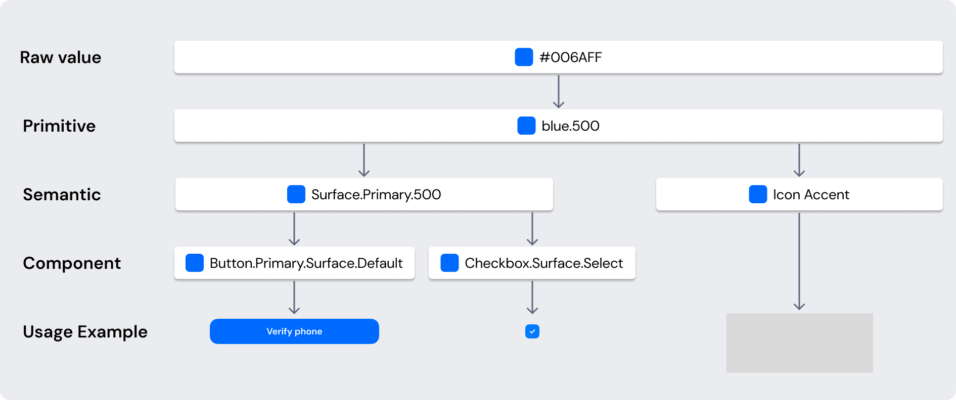 raw HEX values -> Primitive Tokens -> Semantic Tokens -> Component Tokens