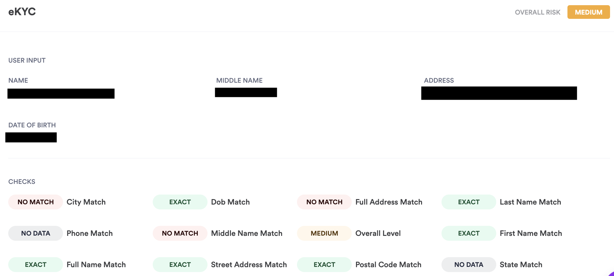 middleNameMatch | exact, fuzzy, nomatch, unknown | Matches middle name submitted against the middle name in the source of truth. |