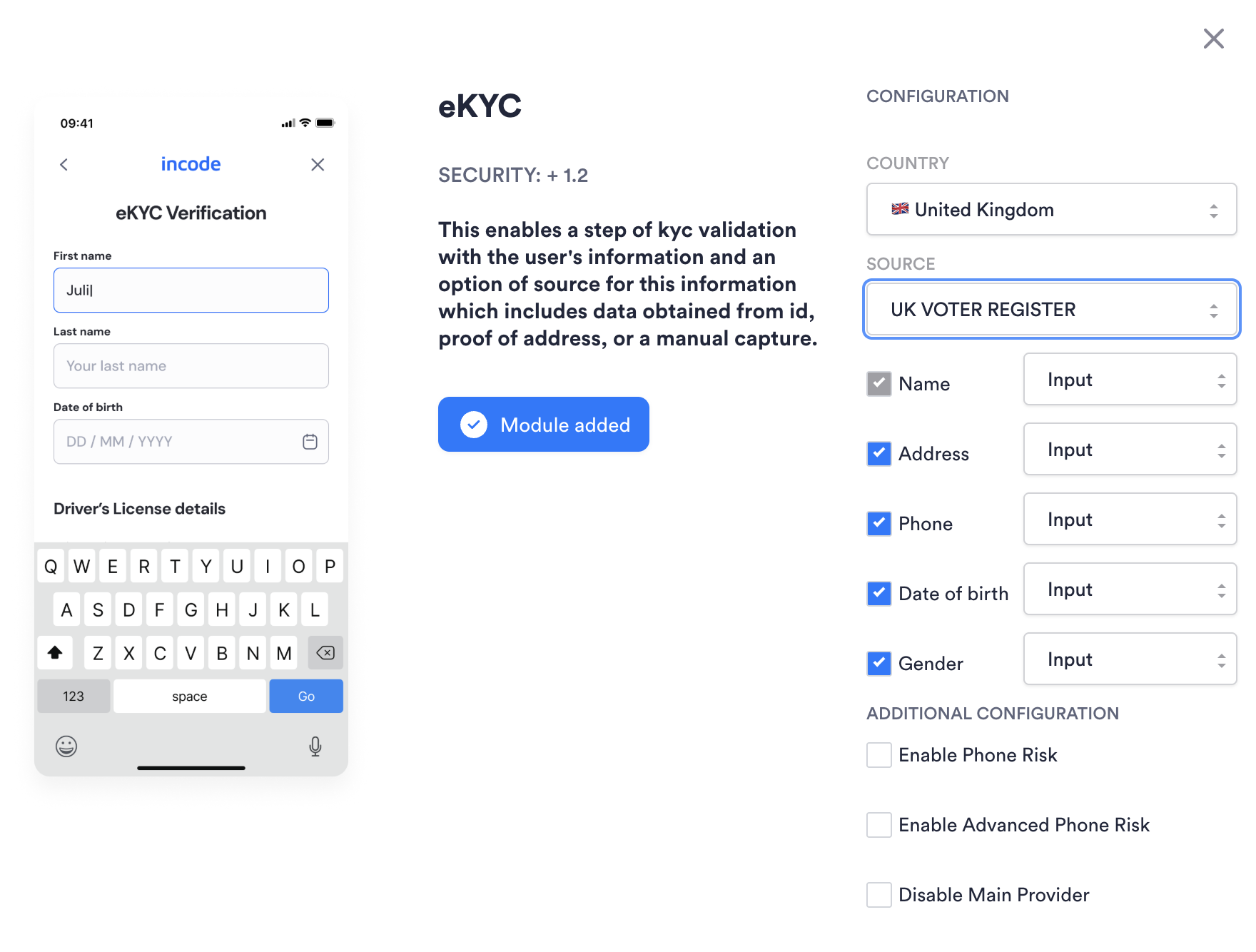 eKYC module configuration gives various options to specify different search criteria with various sources of truth for each country. User data can be collected via a user input flow by using pre-selected fields where users can type in their name or date of birth, etc. See an example below: